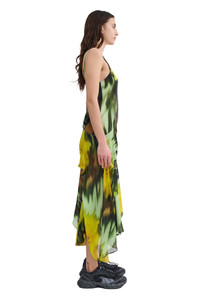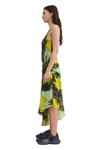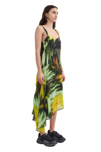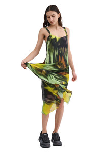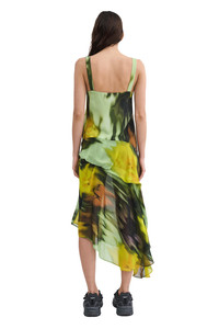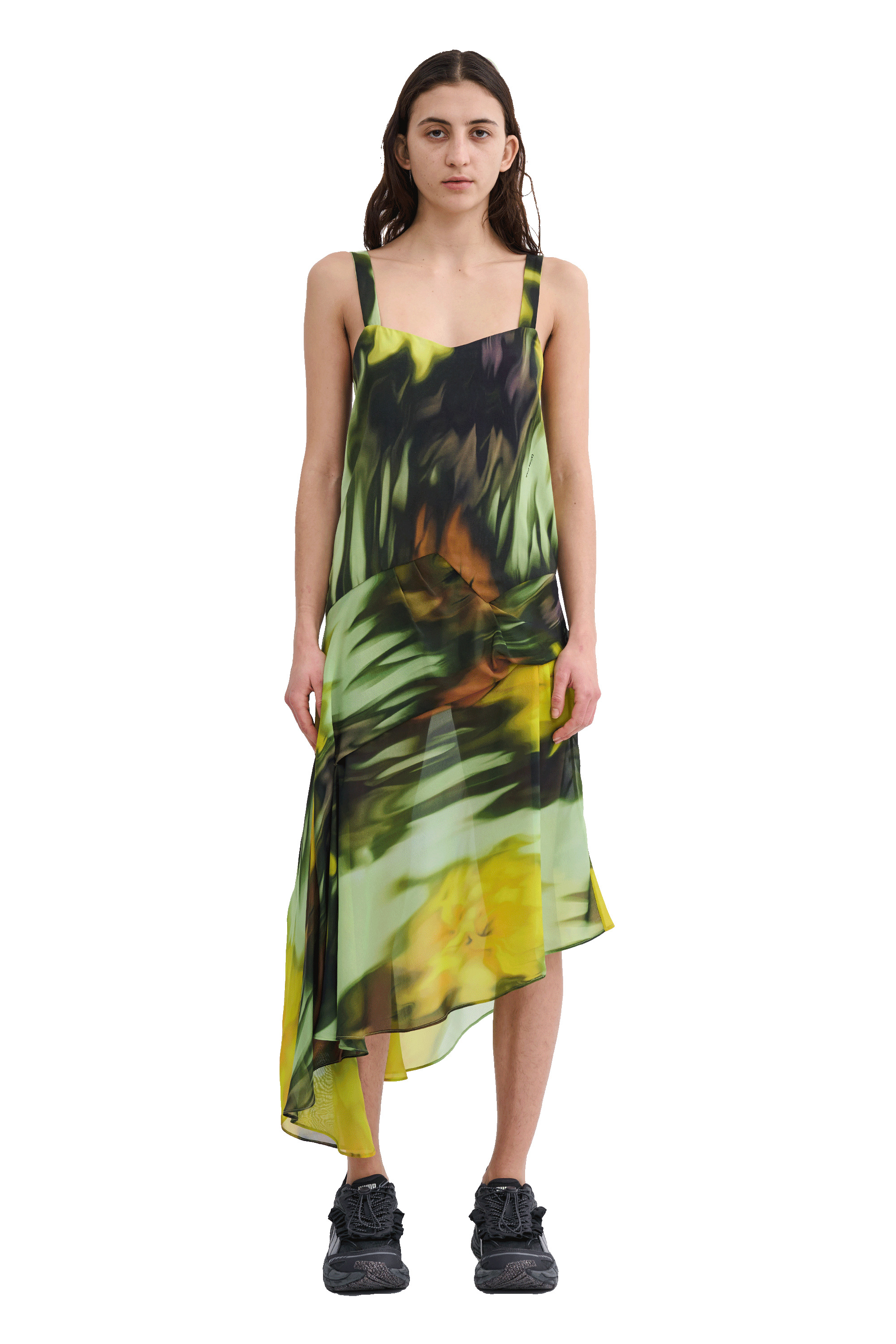 Asymmetrical midi chiffon sheer dress. Collina Strada’s Melting Bloom print. 100% Rose Sylk and Chiffon Made in USA Model wears a size Small Print placement may vary - True to size. - XS=00-2, S=2-4, M=4-6, L=6-8, XL=10-12.