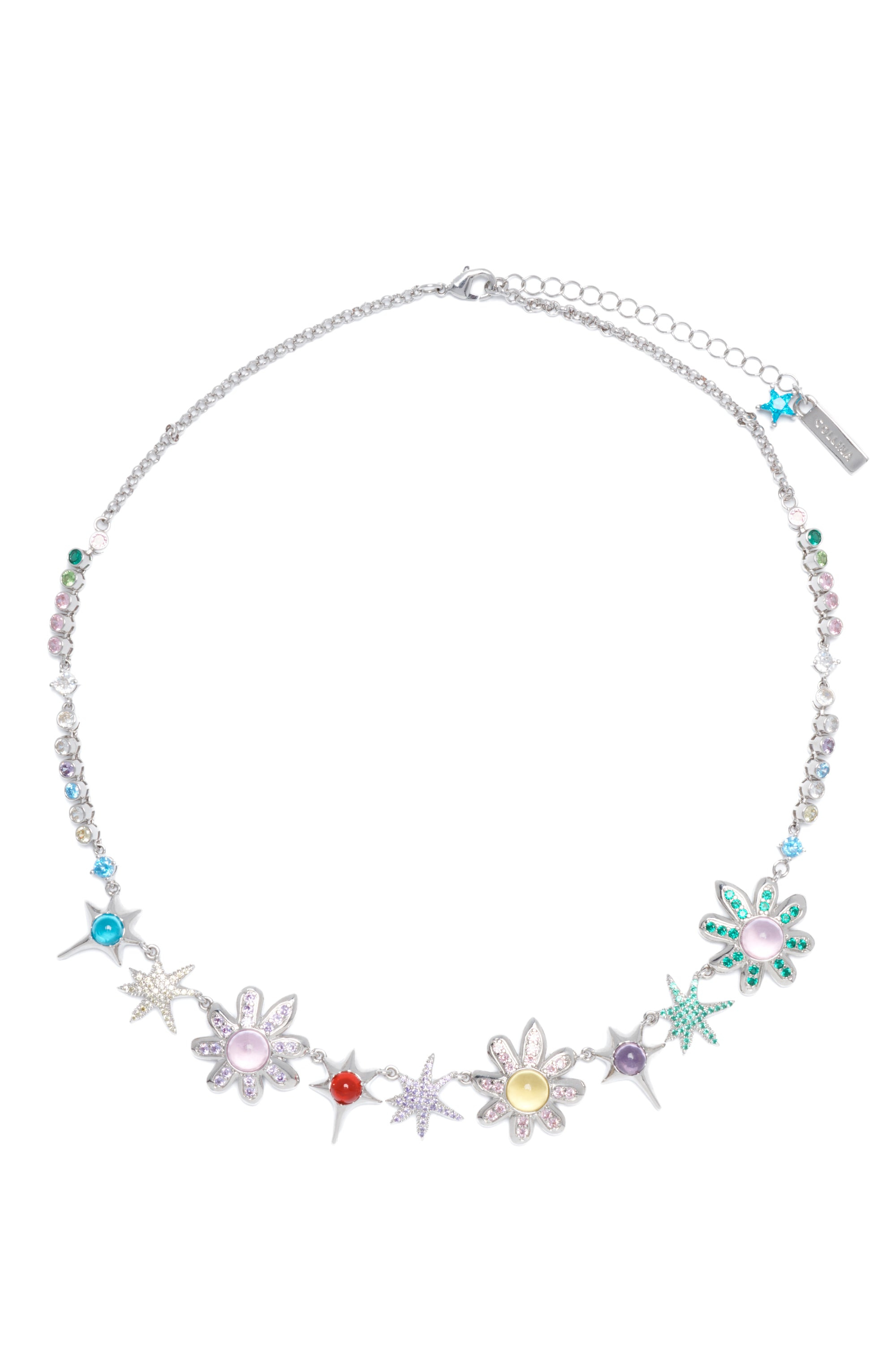 Multi colored meadow necklace with flowers. Adjustable length. Swarovski crystals and plated brass. 48-52.5 cm This is a costume jewelry piece. Please use care with this item and do not wear while bathing or swimming. Excessive wear may cause the finish to deteriorate. Jewelry bag handmade with fabric scraps from our NY studio. Each jewelry bag is one of a kind.