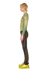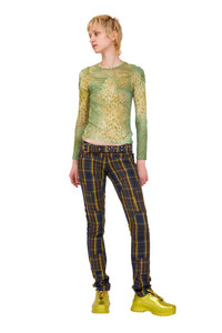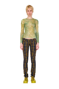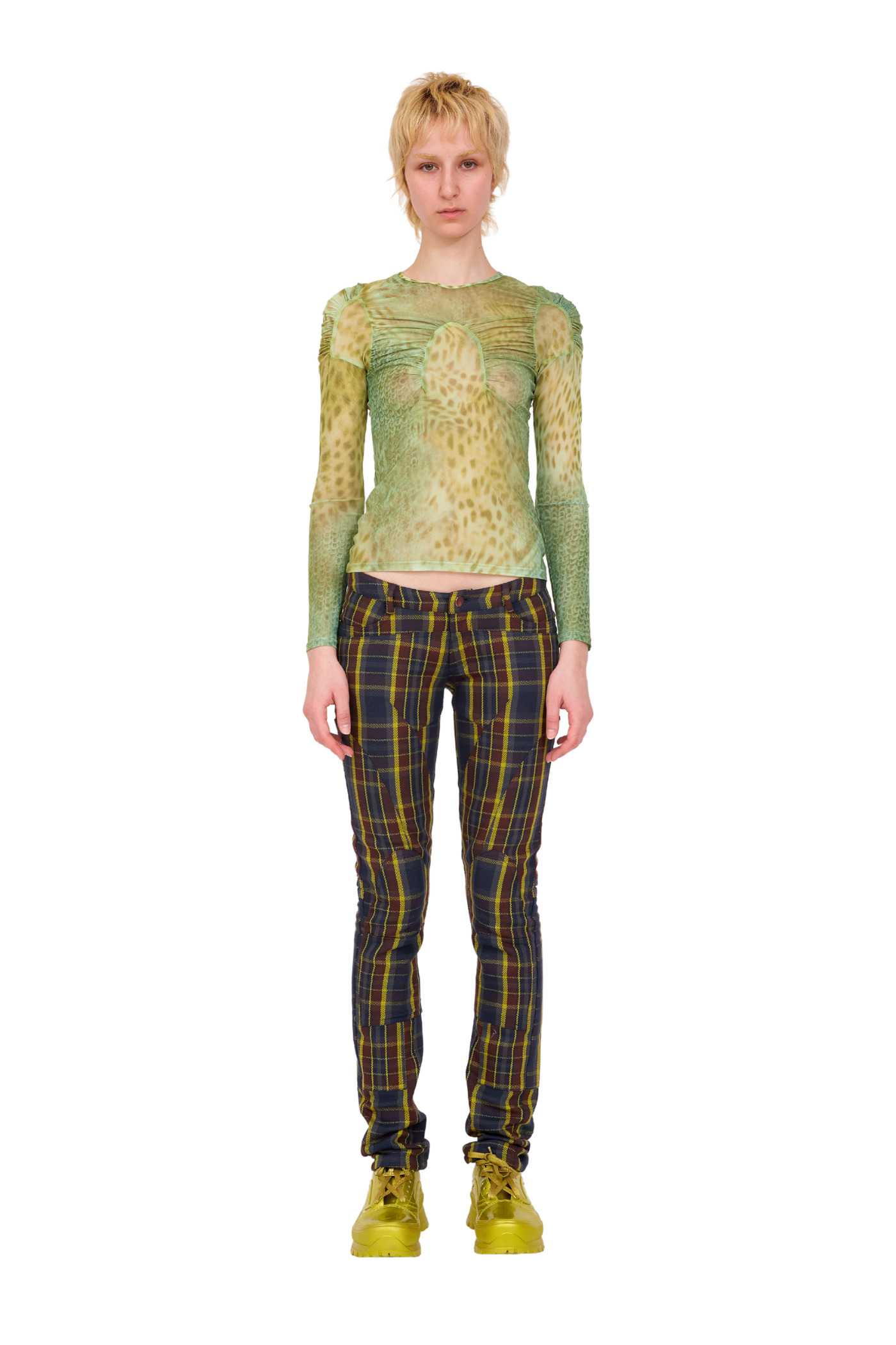 Extra low rise motorcycle pant in woven tartan 100% Cotton Made in New York Model wears a Small. We suggest getting one size larger.