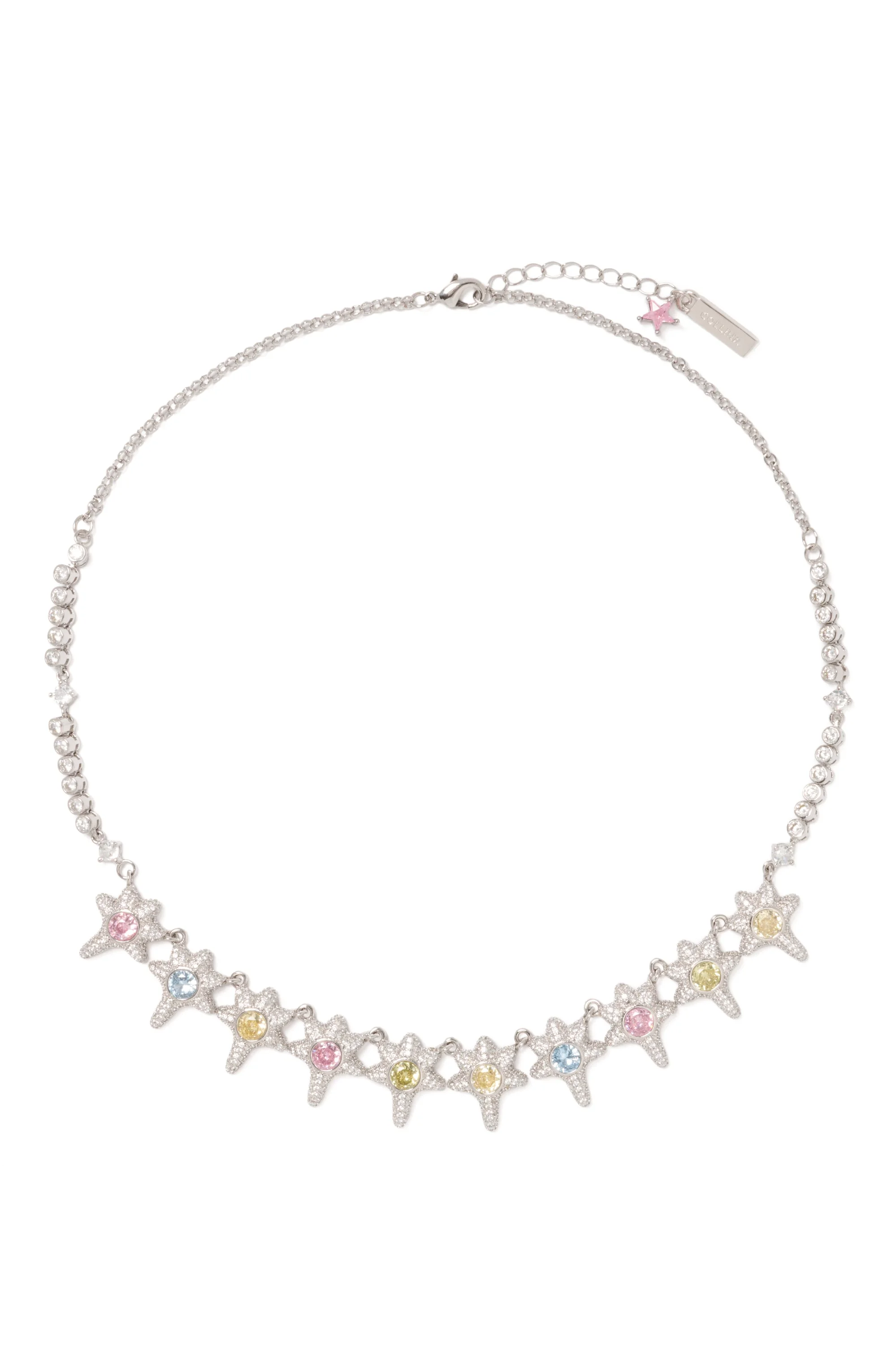 Pastel rhinestone & silver necklace with a star-shaped coral motif. Adjustable length. Plated Brass and Cubic Zirconia Adjustable 48-52.5 cm This is a costume jewelry piece. Please use care with this item and do not wear while bathing or swimming. Excessive wear may cause the finish to deteriorate. Jewelry bag handmade with fabric scraps from our NY studio. Each jewelry bag is one of a kind.