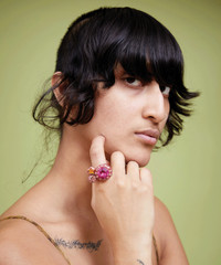 Organically shaped ring made with deadstock cabochons and rhinestones. Hand enameled. Made in USA with recycled pewter. Hand enameled. This is a costume jewelry piece. Please use care with this item and do not wear while bathing or swimming. Excessive wear may cause the finish to deteriorate. Jewelry bag handmade with fabric scraps from our NY studio. Each jewelry bag is one of a kind.