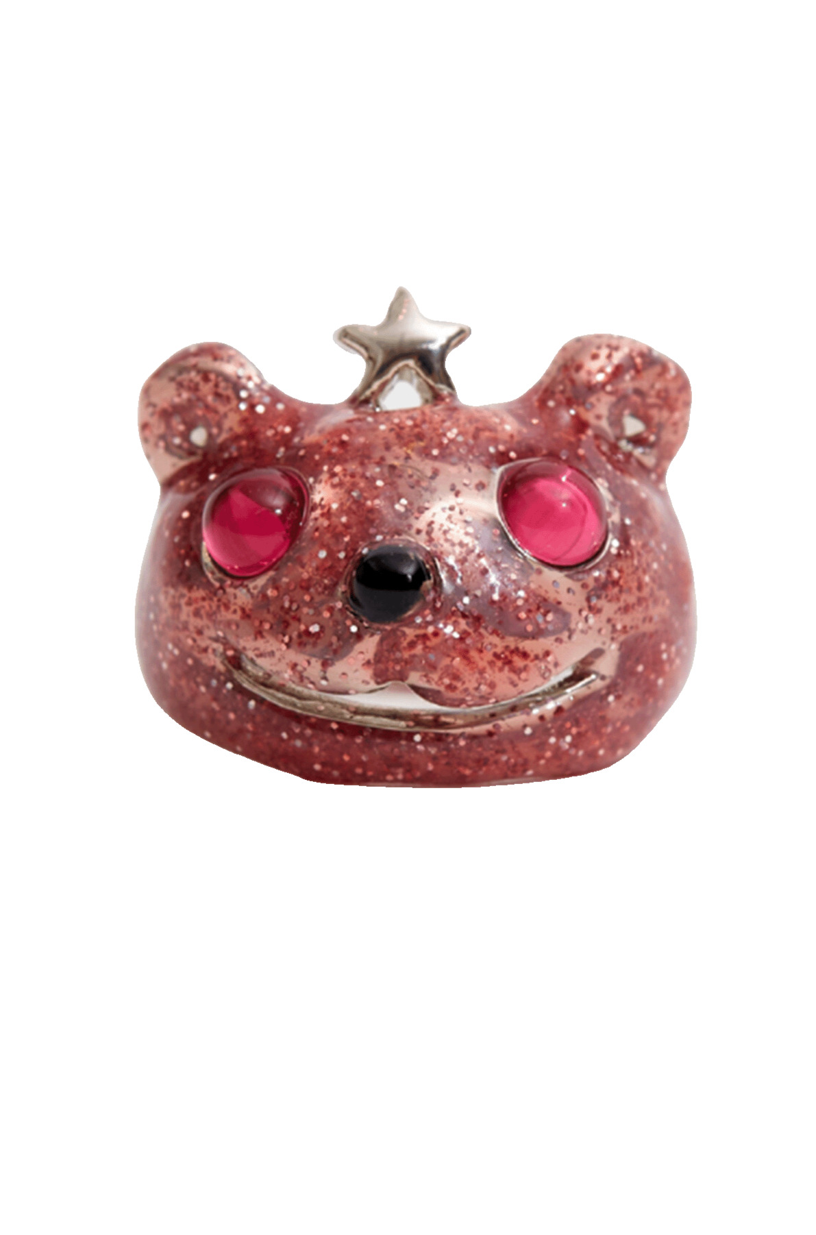 Pink glitter bear ring with hot pink eyes. Hand enameled. Made in USA with recycled pewter. Hand enameled. This is a costume jewelry piece. Please use care with this item and do not wear while bathing or swimming. Excessive wear may cause the finish to deteriorate. Jewelry bag handmade with fabric scraps from our NY studio. Each jewelry bag is one of a kind.