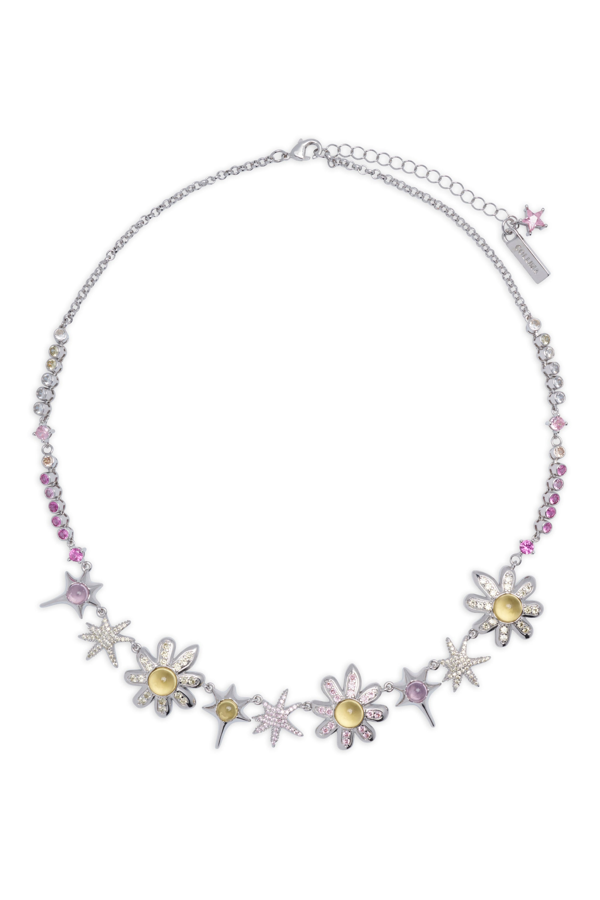 Pink and olivine crystal necklace with flowers. Adjustable length. Swarovski crystals and plated brass. 48-52.5 cm This is a costume jewelry piece. Please use care with this item and do not wear while bathing or swimming. Excessive wear may cause the finish to deteriorate. Jewelry bag handmade with fabric scraps from our NY studio. Each jewelry bag is one of a kind.