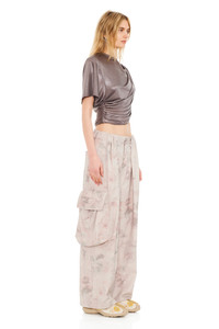 One sleeve top with delicate ruching and artful draping effect on the side. Deadstock jersey. Hidden snap closure. DEADSTOCK: 98% Cotton 2% Lurex Model wears size small and is 5'9''. - Crewneck - Elbow-length sleeves - Made in the USA - XS=00-0, S=2-4, M=4-6, L=6-8, XL=10-12