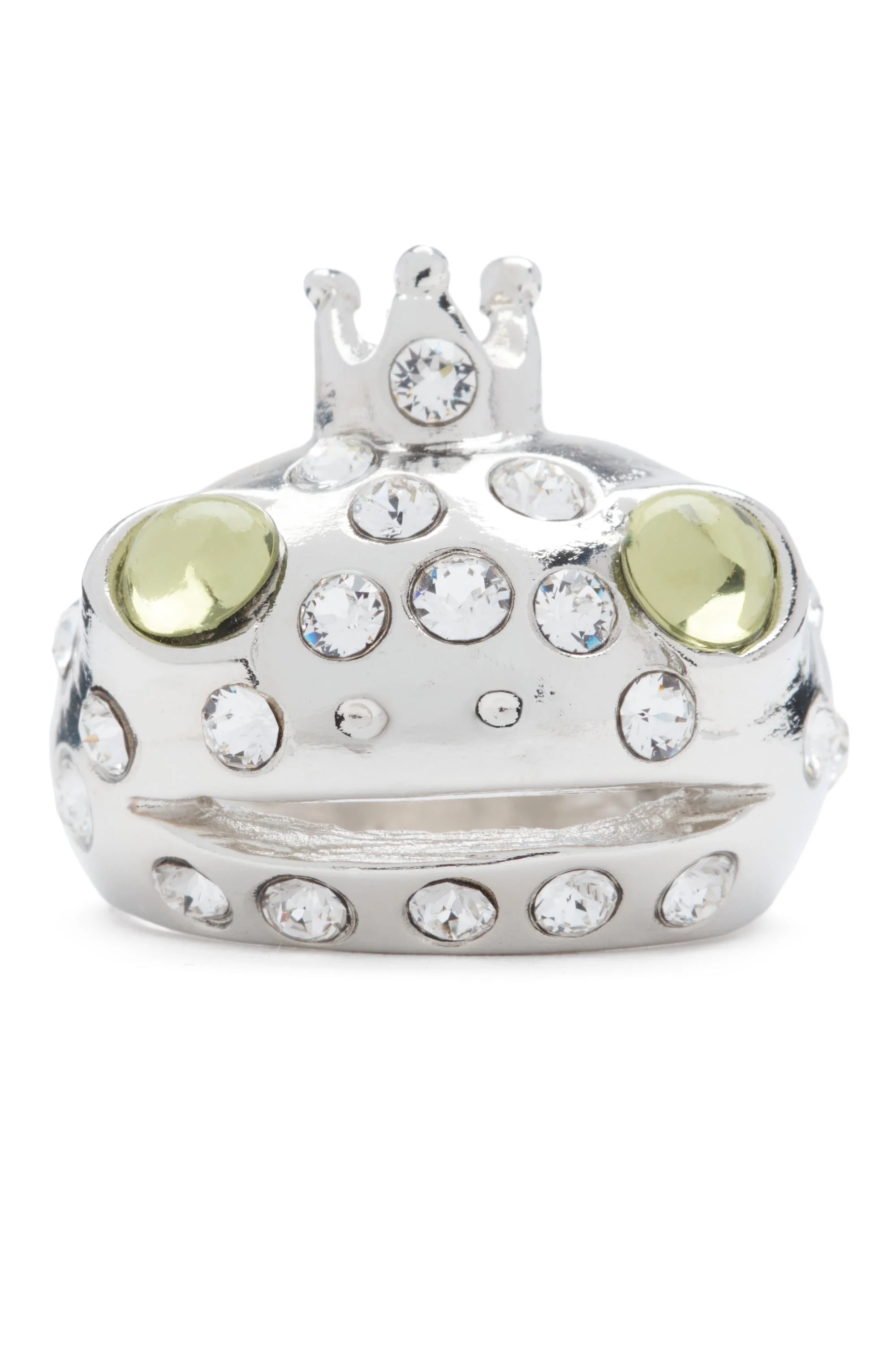 Frog prince ring with deadstock crystal freckles. Made in USA with recycled pewter. This is a costume jewelry piece. Please use care with this item and do not wear while bathing or swimming. Excessive wear may cause the finish to deteriorate. Jewelry bag handmade with fabric scraps from our NY studio. Each jewelry bag is one of a kind.