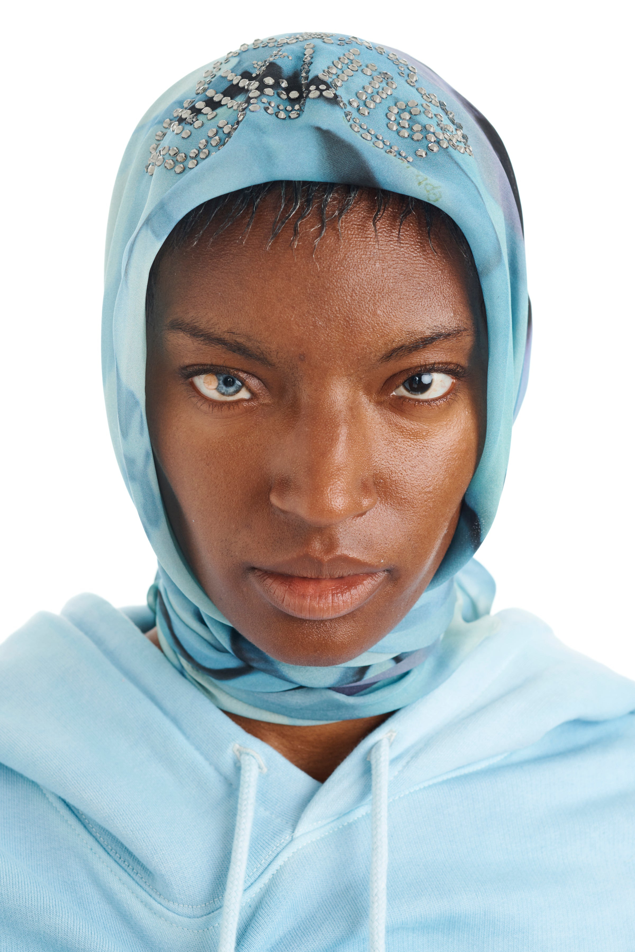 Sky Watercolor Floral print silk chiffon scarf with custom Collina Tiara rhinestone design on the forehead. 100% Silk 36 in x 36 in Made in USA