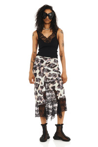 Sculpted floral-lace insets eat into the snow leopard print crepe of this stunning bias-cut skirt finished with a swingy handkerchief hem. Side seam zipper. Model wears size Small - 36" length (size Medium) - Hidden side-zip closure - Unlined - 100% viscose with 49% recycled nylon 51% nylon trim - Made in New York - Dry clean - True to size - XS=00-0, S=2-4, M=6-8, L=8-10