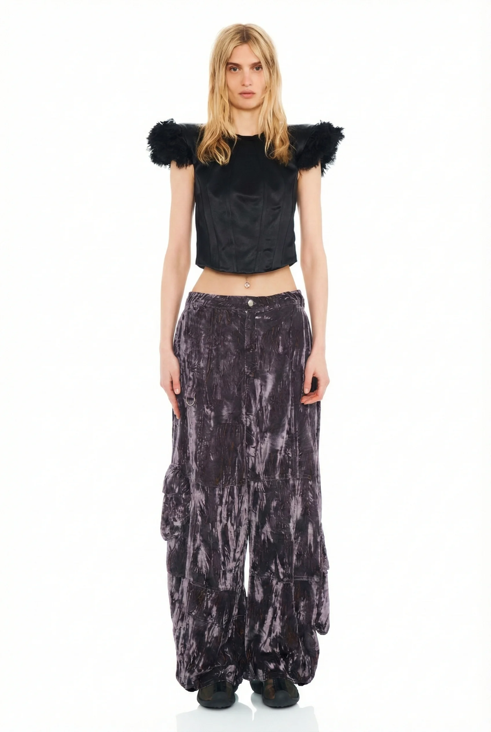 Relaxed fit with mid rise, wide leg cargo pant with large pockets all over so you can go out without a bag! Crushed velvet. 63% Acetate 37% Cupro Rayon Made in New York - Oversized - Model is XXX and wears size S - XS=0-2, S=2-4, M=4-6, L=6-8, XL=10-12