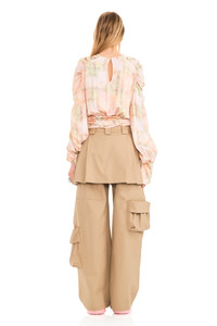 Washed Daisy Plaid puffed long sleeves with gathered detailing at the shoulders and cuffs. The front has a cinched waist with tie detail. Keyhole at the back. Model wears size Small and is 5'11''. 100% Rayon Made in USA - True to size. - XS=0-2, S=2-4, M=4-6, L=6-8, XL=10-12.