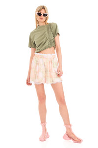 Mini boxers with lace layer peeking through. Elastic waist Collina Strada's custom Washed Daisy Plaid print and custom recycled nylon lace. Embroidered Collina logo on waistband. 100% Rayon and 49% Recycled Nylon 51% Nylon Model wears a Small Made in USA - True to size. - XS=00-0, S=2-4, M=4-6, L=6-8, XL=10-12.