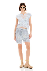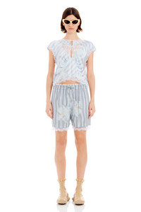 Boxers with lace layer peeking through. Elastic waist Collina Strada's custom Washed Wavy Navy Flower Stripe print and custom recycled nylon lace. 100% Rose Sylk and 49% Recycled Nylon 51% Nylon Model wears a Small and is 5'11'' Made in USA - XS=0-2, S=2-4, M=4-6, L=6-8, XL=10-12.