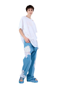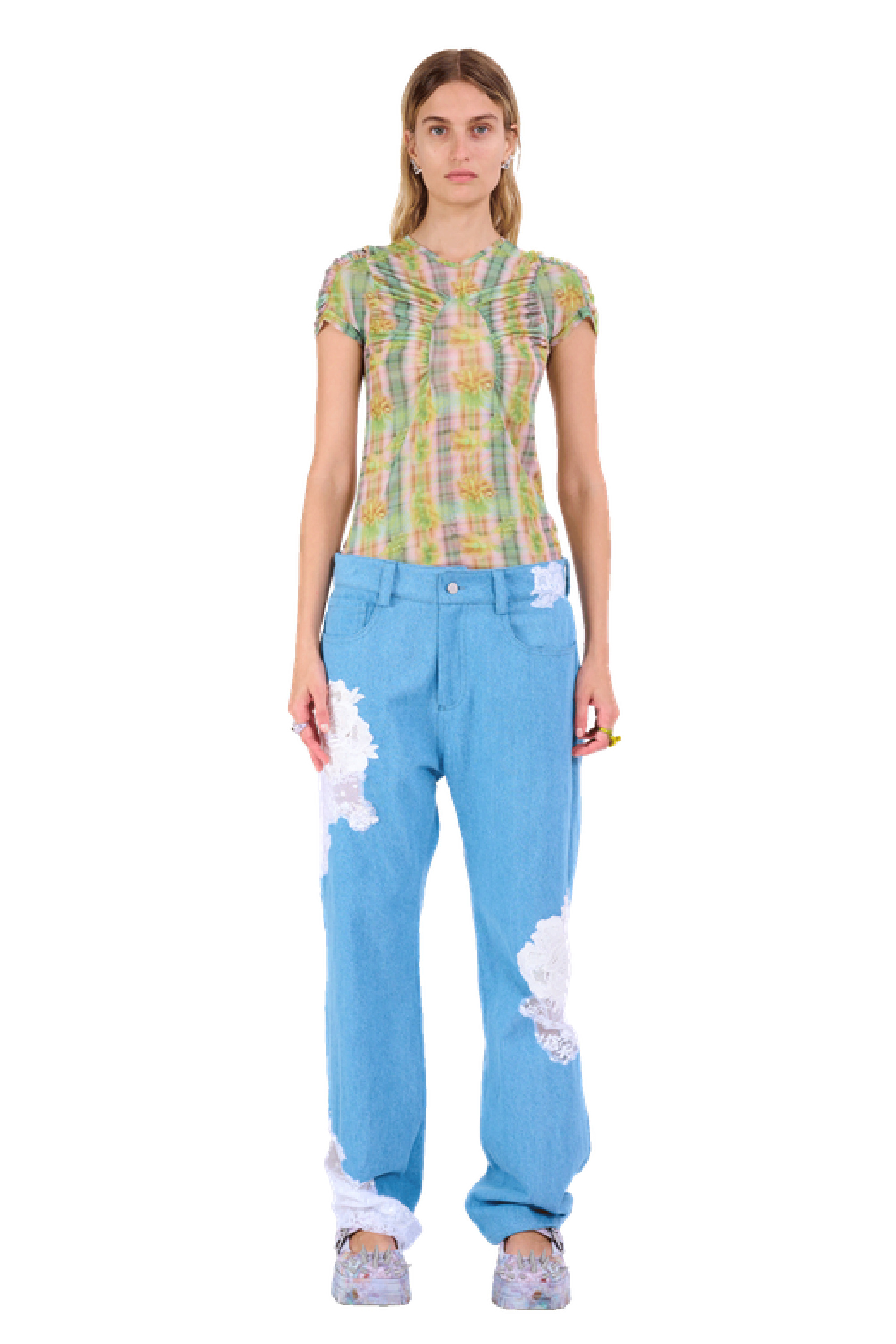 Mid-rise, relaxed fit jean with lace cut outs and sequin details. 100% Cotton Made in India Model wears a size Small. - Runs oversize - XS=00-0, S=2-4, M=4-6, L=6-8, XL=10-12.