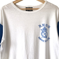 J.S Homestead X Nigel Cabourn The Drawing Room RNCC Submarine USN Slub Tee. Tag The Drawing Room, made in Japan. Size : 48 (Fits L/XL) Measurement : Width (Armpit-armpit) : 22 Inch Length (Shoulder to bottom) : 28 Inch Material : Cotton Condition : A A+ = Perfect! (Almost new/new/deadstock) A = Great (All in good shapes. No fade spot/fades). B+ = Vintage looks (minor fade spot/fades). B = Vintage looks with minor defect (stain/rip or hole/minor damage). Please read our shop policies before buying. Please also check the details and measurement. If you need further details, do contact us. Thank you for viewing!