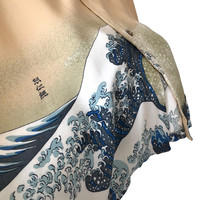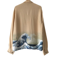 Authentic Vintage Denime Japan Big Wave Kanagawa Hand-printed Heritage Rayon Shirt. Tag Denime, handmade in Japan. Kanagawa Wave painting is a Japanese heritage art originally created since the Endo Era. Representing the big wave or tsunami that commonly occur in Japan during that era. Size : L Measurement : Width (Armpit-armpit) : 22.5 Inch Length (Shoulder to bottom) : 28.5 Inch Material : 100% Rayon Condition : A A+ = Perfect! (Almost new/new/deadstock) A = Great (All in good shapes. No fade spot/fades). B+ = Vintage looks (minor fade spot/fades). B = Vintage looks with minor defect (stain/rip or hole/minor damage). Please read our shop policies before buying. Please also check the details and measurement. If you need further details, do contact us. Thank you for viewing!