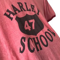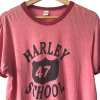 Russell Ath. Japan Vintage Repro Harley School Distressed Ringer Tee. Tag Russell Athletic, all single stitches, made in Japan. Size : L Measurement : Width (Armpit-armpit) : 22 Inch Length (Shoulder to bottom) : 27 Inch Material : Cotton Condition : A (Paperthin, holes) A+ = Perfect! (Almost new/new/deadstock) A = Great (All in good shapes. No fade spot/fades). B+ = Vintage looks (minor fade spot/fades). B = Vintage looks with minor defect (stain/rip or hole/minor damage). Please read our shop policies before buying. Please also check the details and measurement. If you need further details, do contact us. Thank you for viewing!
