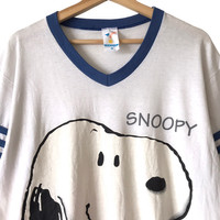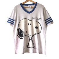 Artex Sportswear Snoopy Vintage 1990s Tee. Tag Artex Sportswear, all single stitches, made in USA. Size : L Measurement : Width (Armpit-armpit) : 22.5 Inch Length (Shoulder to bottom) : 28 Inch Material : Cotton / Polyester Condition : B (Color fades) A+ = Perfect! (Almost new/new/deadstock) A = Great (All in good shapes. No fade spot/fades). B+ = Vintage looks (minor fade spot/fades). B = Vintage looks with minor defect (stain/rip or hole/minor damage). Please read our shop policies before buying. Please also check the details and measurement. If you need further details, do contact us. Thank you for viewing!
