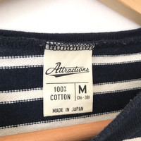 Attractions Japan Basic 3Q Border Tee. Tag Attractions, made in Japan. Size : M Measurement : Width (Armpit-armpit) : 19.5 Inch Length (Shoulder to bottom) : 26 Inch Material : Cotton Condition : A A+ = Perfect! (Almost new/new/deadstock) A = Great (All in good shapes. No fade spot/fades). B+ = Vintage looks (minor fade spot/fades). B = Vintage looks with minor defect (stain/rip or hole/minor damage). Please read our shop policies before buying. Please also check the details and measurement. If you need further details, do contact us. Thank you for viewing! *** Please expect delays on some shipment due to the Covid-19 global pandemic. Will do the best to keep purchases safely delivered in good condition. Stay safe & let’s hope for a better future! Thank You!