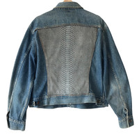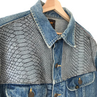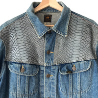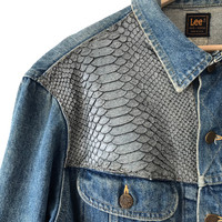 Authentic Vintage 1990s Lee Rider USA Snakeskin Denim Trucker Jacket. Tag Lee Rider, made in USA. Size : 46 (Fits L/XL) Measurement : Width (Armpit-armpit) : 23.5 Inch Length (Shoulder to bottom) : 25 Inch Material : Cotton Condition : A A+ = Perfect! (Almost new/new/deadstock) A = Great (All in good shapes. No fade spot/fades). B+ = Vintage looks (minor fade spot/fades). B = Vintage looks with minor defect (stain/rip or hole/minor damage). Please read our shop policies before buying. Please also check the details and measurement. If you need further details, do contact us. Thank you for viewing!