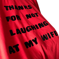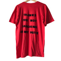 Thanks For Not Laughing At My Wife Vintage 1970s Funny Wording Tee. Tag M (Unknown 70s/80s), single stitches, made in USA. Size : XL (Fit M/L) Measurement : Width (Armpit-armpit) : 21 Inch Length (Shoulder to bottom) : 28.5 Inch Material : Cotton / Polyester Condition : A (Some pinholes) A+ = Perfect! (Almost new/new/deadstock) A = Great (All in good shapes. No fade spot/fades). B+ = Vintage looks (minor fade spot/fades). B = Vintage looks with minor defect (stain/rip or hole/minor damage). Please read our shop policies before buying. Please also check the details and measurement. If you need further details, do contact us. Thank you for viewing!