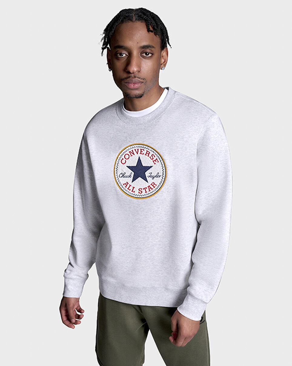A soft pullover with a textured twist on an iconic patch. EXTRA COZY Fall’s all about texture—and this one delivers. Made from soft cotton fleece, this sweatshirt levels up the cozy feels and heritage look with a chenille Chuck Taylor All Star patch. WHY YOU SHOULD BE DOWN - Fleece crewneck sweatshirt made from 100% cotton feels warm and soft against the skin - Standard fit for an easygoing look - Chenille Chuck Taylor All Star patch for heritage style - 100% cotton - SKU: CVM53K02-LGH