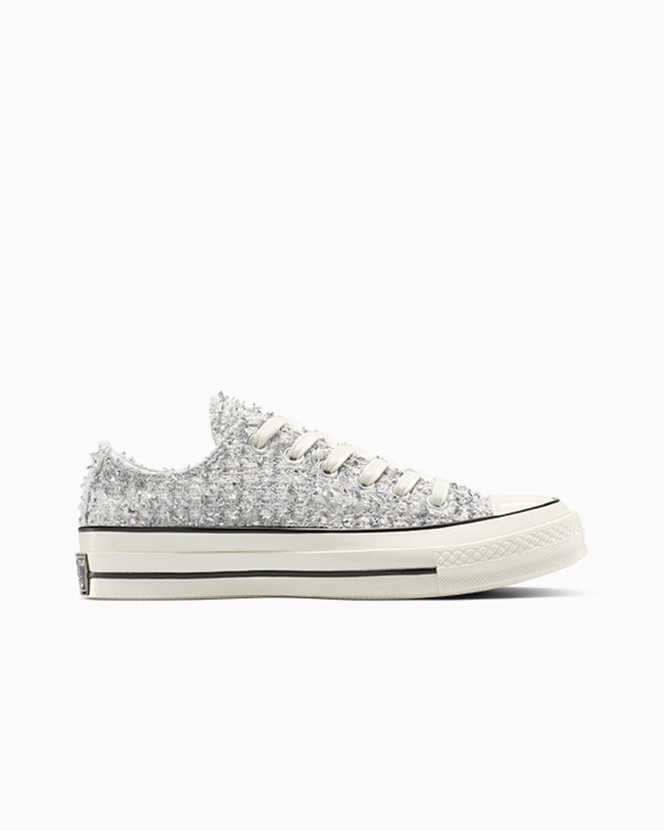 Preppy meets party. BEST DRESSED All dressed up and *everywhere* to go. These show-stopping Chuck 70s are sure to be a hit—wherever the party takes you. WHY YOU SHOULD BE DOWN - A metallic, tweed-like woven upper adds texture and shine to any outfit - OrthoLite cushioning helps provide optimal underfoot comfort - Waxed laces add a premium touch - Classic silver comes ready to celebrate - Signature All Star license plate - SKU: A14443C