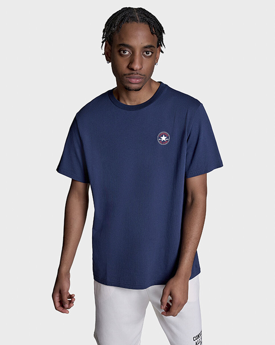 A classic essential with soft comfort and a fit that holds up. SIMPLE & SOLID This soft cotton tee delivers everyday comfort with a timeless fit and an easy feel. It’s a staple you can count on—in a wear-with-everything range of colors. WHY YOU SHOULD BE DOWN - Cotton fabric feels soft against the skin - Standard fit that’s made to move - Chuck Taylor All Star patch on left chest - 100% cotton - SKU: CVM5T565-NVY