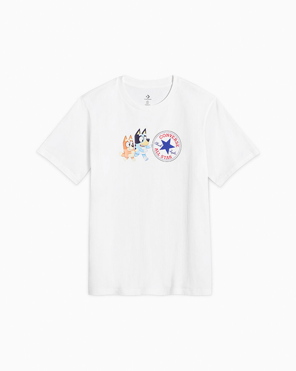Converse celebrates the playful energy of Bluey with a limited-edition t-shirt. CONVERSE X BLUEY Celebrate the power of creative play with a limited-edition Bluey t-shirt, featuring Bluey and Bingo alongside a Chuck Taylor All Star patch. WHY YOU SHOULD BE DOWN - Limited-edition cotton jersey t-shirt made in collaboration with Bluey - Center front Bluey screenprint graphic with Converse branding - Water-based and rubber-ink graphic execution - Standard fit for a relaxed, easy feel - 100% Cotton - SKU: CVM5T501-WHT