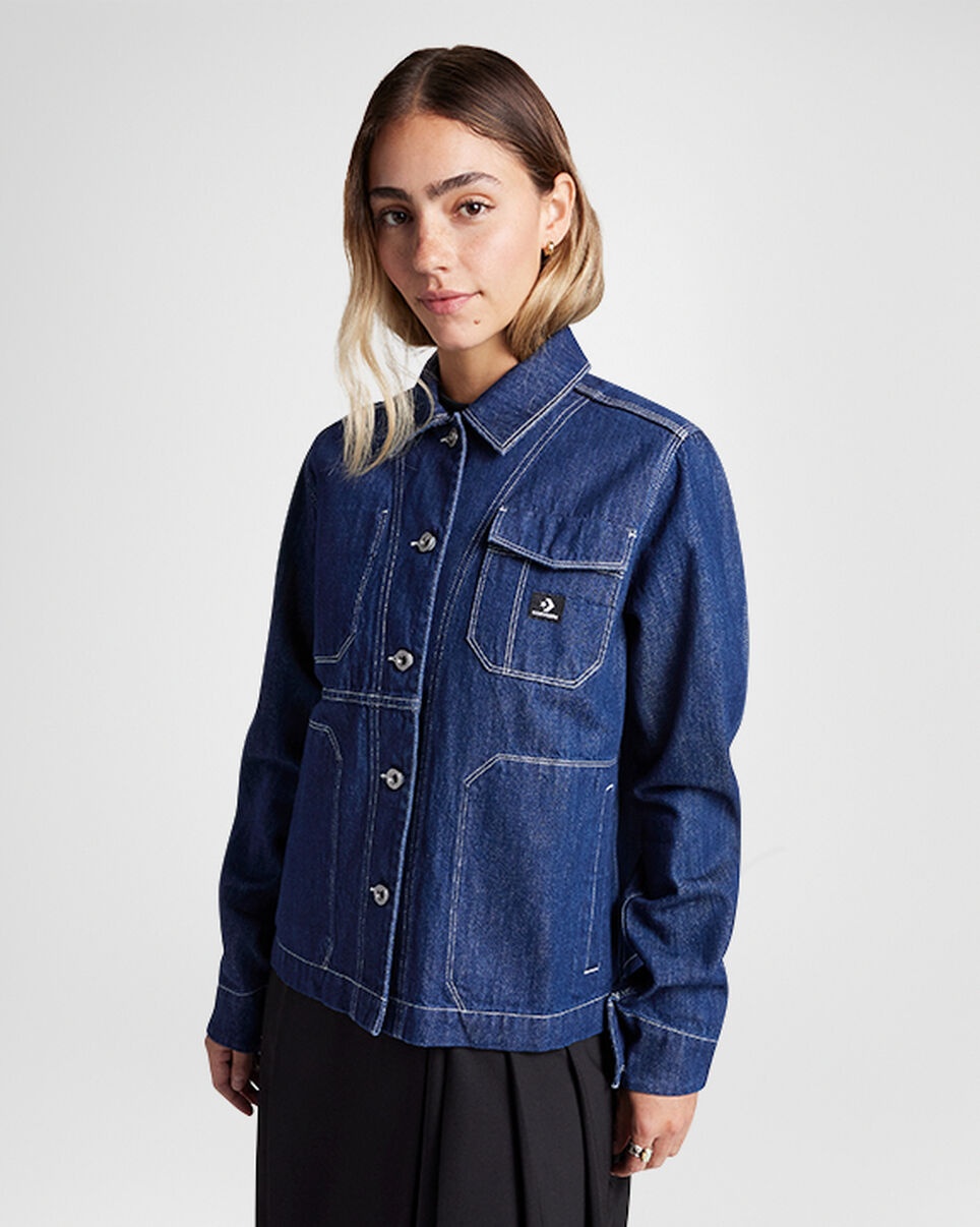 Layer up in this carpenter-inspired work coat. WORK IT Everybody needs a go-to jean jacket, and this one goes above and beyond. Layer it over your favorite top to complete your look. Plus, large pockets help you stay hands-free. WHY YOU SHOULD BE DOWN - Midweight denim is comfortable and durable - Standard fit for a relaxed, easy feel - Functional buttons allow for easy layering - Hand and chest pockets store small items on the go - Subtle Converse logo at left chest pocket - SKU: 10027976-A02