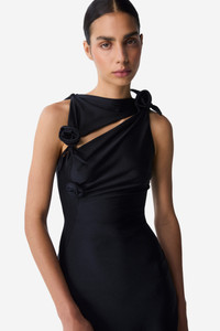 Coperni's stretch black minidress is cut with a subtle asymmetrical twist and is designed for a close sculptural fit. It has a dynamic cut-out neckline punctuated by three swirling fabric roses for a knotted effect. DETAILS - Composition: 80% Polyamide 20% Elastane - Made in: France - Sku: COPR154F5001