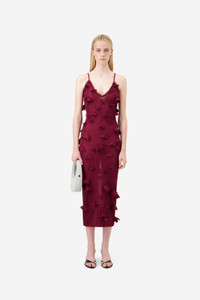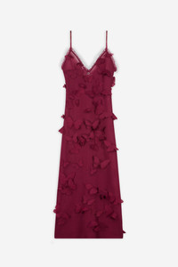 In constant motion. This red techno maxi dress is brought to life with sculpted butterflies scattered across its surface, as if gently lifted by an invisible breeze. Cut out from a smooth technical fabric, it hugs the body while applique adds dimension and delicate contrast. A playful illusion and architectural precision. DETAILS - Composition: Polyester - Made in: Italy - Sku: COPML166Y3015