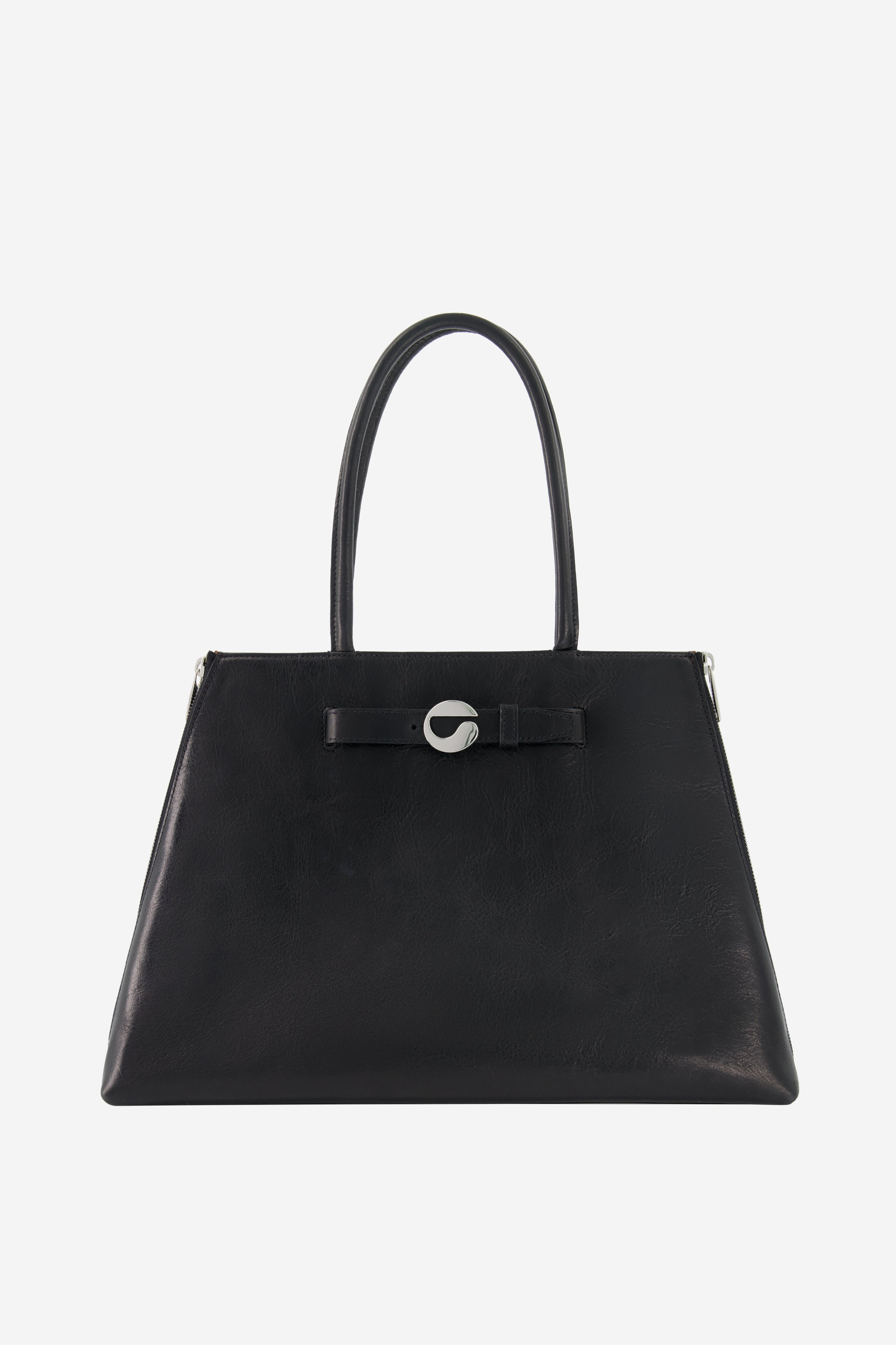 Data Bag blends sharp geometry with soft structure through its trapezodial silhouette. Designed for everyday elegance, it's crafted in supple calf leather with a subtly crinkled finish that catches the eye. Zippers on both sides allow for adjustable volume - practical for extra essentials. DETAILS - Composition: Calf Leather - Made in: Italy - Sku: COPBA121F6064