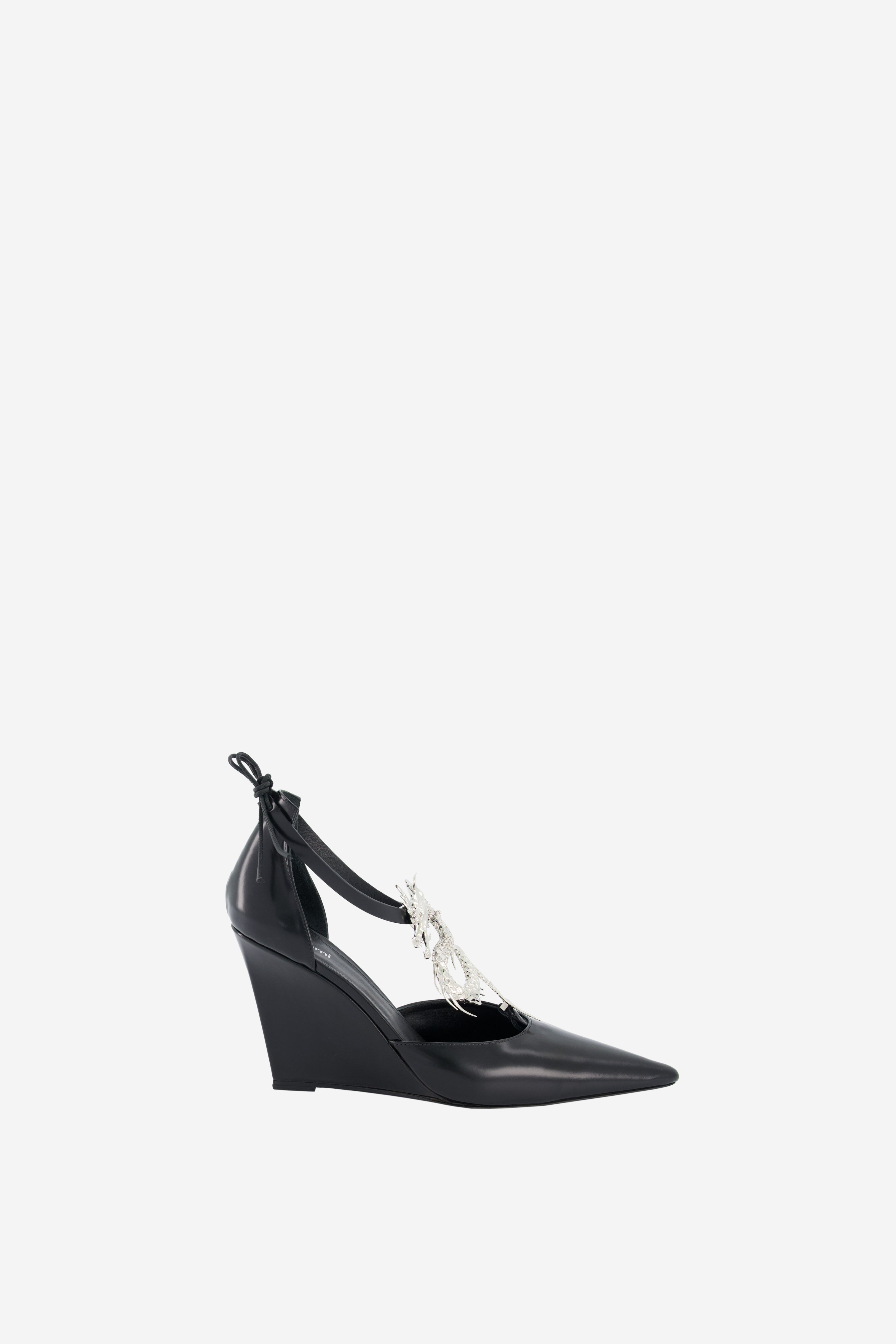 A sharp silhouette meets mythical detail - this pointed wedge pump wraps the foot in sleek black leather, anchored by a sculptural silver-tone dragon hardware winding across the heel. DETAILS - Composition: Leather - Made in: Spain - Sku: COPSH94F6045
