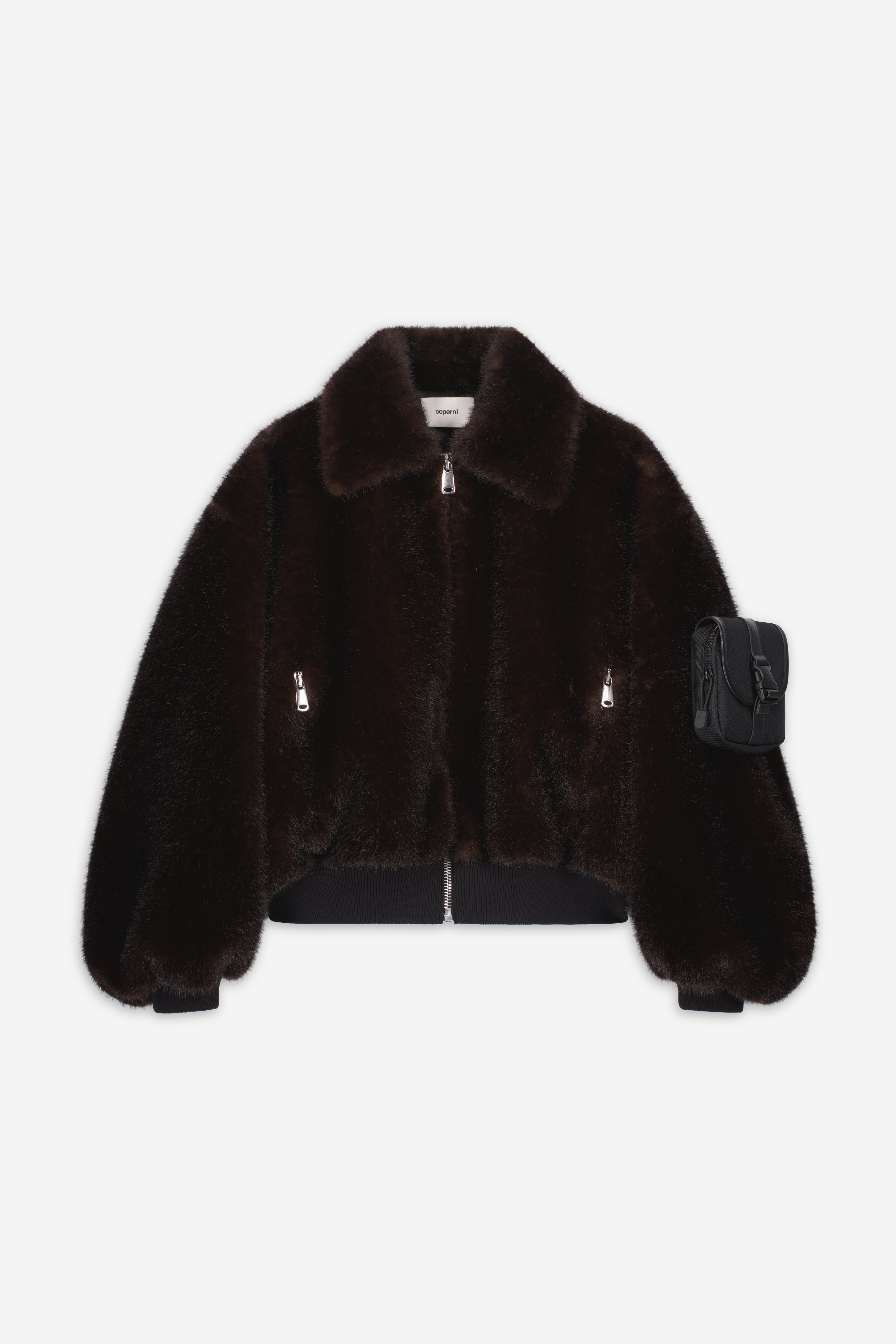 A Coperni staple reimagined in a soft faux fur. This brown bomber jacket delivers sculptural volume with a clean finish. Its stand collar, cocoon-like sleeves and subtly cinched waist create a strong, modern silhouette. It's a sleek outerwear choice, finished with a tonal logo patch on the arm for the utilitarian edge. DETAILS - Composition: Recycled Polyester - Made in: Portugal - Sku: COPBL33F9015