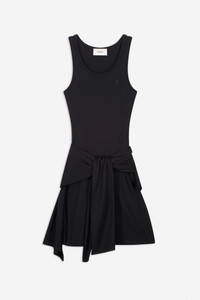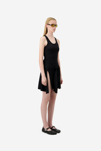 This black jersey dress fuses athletic minimalism with sculptural play. Designed with a body-hugging tank top upper, it features a dramatic front slit and a knotted drape at the hip, mimicking the nonchalance of a sweatshirt tied around the waist. The asymmetric hemline adds movement while a folded label detail at the back nods to deconstructed streetwear. A subversive take on casual codes. DETAILS - Composition: Cotton-Modal - Made in: Portugal - Sku: COPJS160F5009