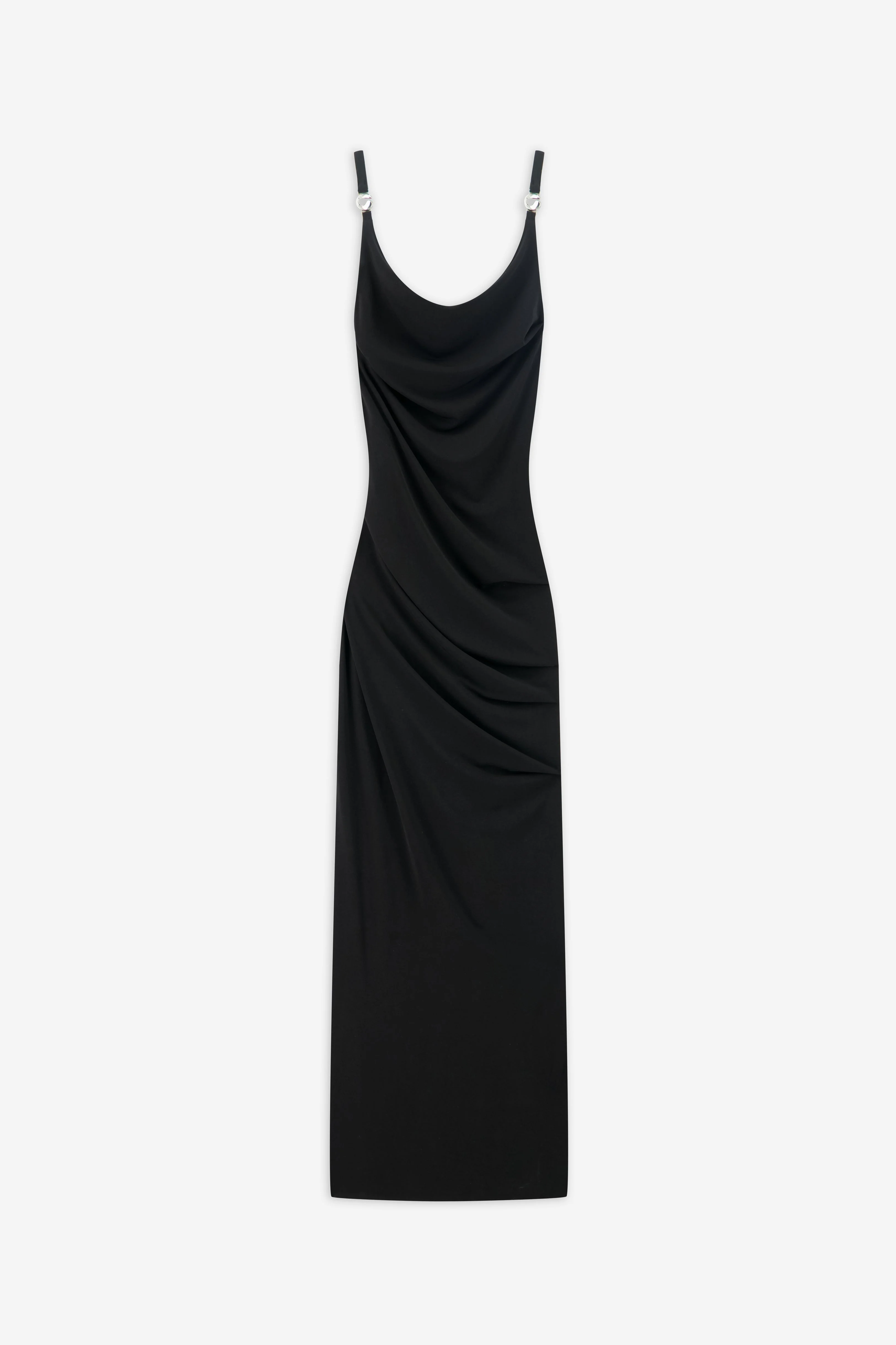 Crafted from fluid jersey, this floor-length dress clings and flows with effortless elegance. A softly draped cowl neckline meets two sculptural straps - one slim, one bold - connected by metallic logo clasps. The open back reveals an unexpected twist. Minimal, sensual, and quietly dramatic, this silhouette evokes movement even in stillness. DETAILS - Composition: Polyester - Made in: Italy - Sku: COPR205F5022