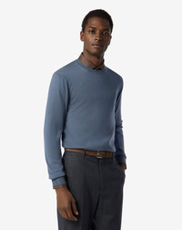 This aviator blue long-sleeved crew neck jumper is made from extra fine combed triple twisted pure merino wool, a yarn characterised by elasticity, strength and a bright, compact feel. With its medium gauge, the garment is both durable and resistant to pilling. The yarn is OEKO-TEX-certified, to guarantee sustainable and traceable quality. DETAILS AND MATERIALS - 100% virgin wool - long-sleeved crew neck jumper made from extra fine combed triple twisted merino wool - 12 gauge - Made in Italy FIT & WASHING - Dry clean with perchloroethylene, do not bleach, do not tumble dry, maximum iron temperature 110°