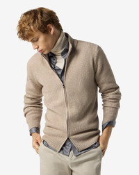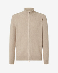 A garment that combines lightness and comfort, this beige full-zip, long-sleeved jumper is made from a fine mix of virgin wool, cashmere and natural fibres. The yarn was treated in a special way to ensure an incredibly soft feel, unparalleled lightness and natural elasticity for a perfect fit and long lasting comfort. Fully made in Italy, this jumper provides the perfect balance between functionality and sophisticated style, designed for the modern man who seeks high quality versatile garments. DETAILS AND MATERIALS - 43% virgin wool, 24% cashmere, 28% viscose, 5% polyamide - full zip long-sleeved wool, viscose and cashmere jumper - 7 gauge - Made in Italy FIT & WASHING - Dry clean with perchloroethylene, do not bleach, do not tumble dry, maximum iron temperature 110°