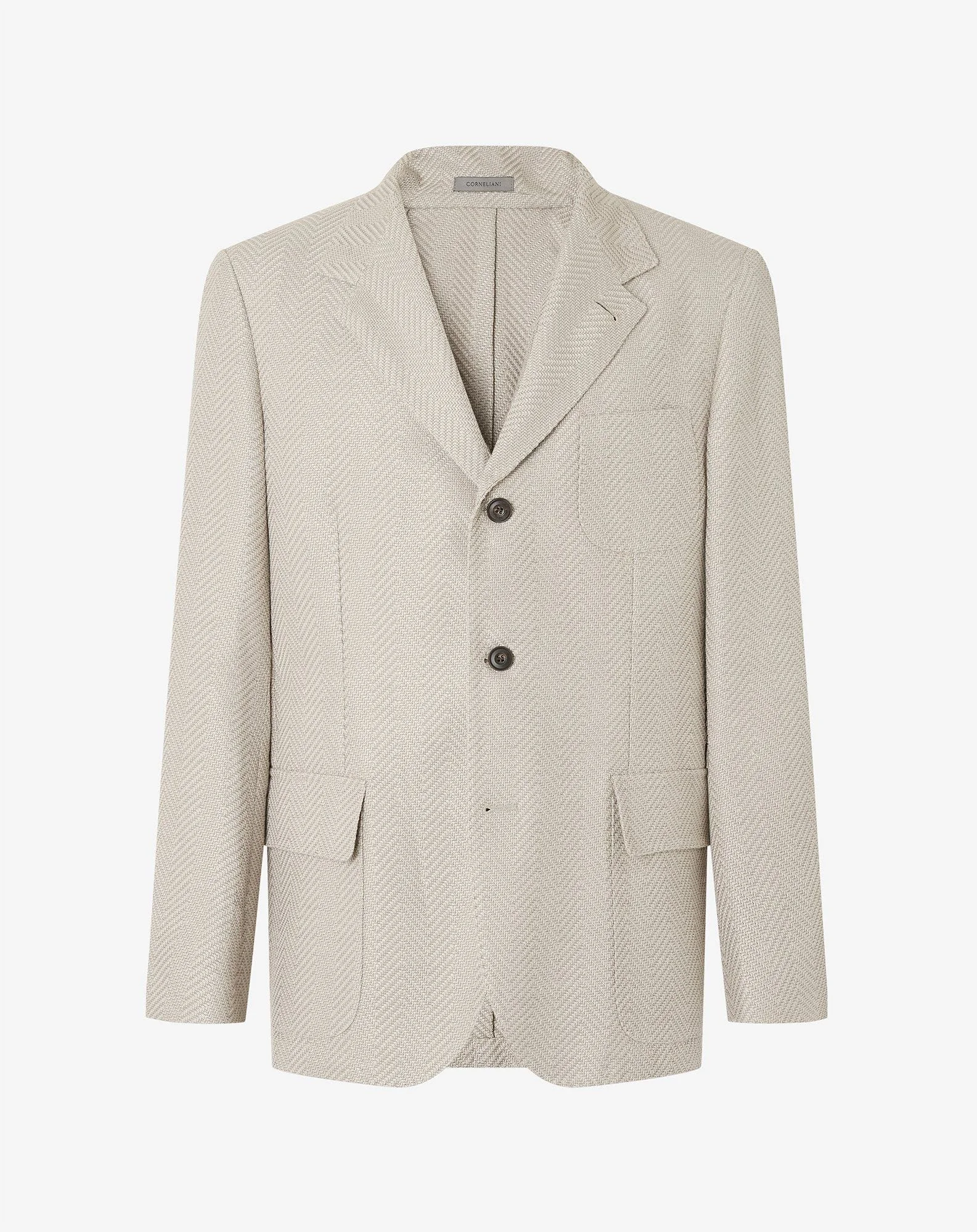 Its linen and wool herringbone weave and its light unlined construction are the distinctive features. This beige, single-breasted jacket with four buttons, drop 7, and regular fit is finished with AMF edge stitching and 8 cm unironed lapels for a more casual tone. A breast patch pocket, side flap pockets and double back slit complete a 74 cm long style designed for summer separates. DETAILS AND MATERIALS - 74% linen, 24% virgin wool, 2% polyamide - single breasted 4-button jacket - unlined - drop 7 - regular fit - AMF stitching at the edge - appliqued outbreast pocket - appliqued flap side pockets - non-ironed lapels - lapel width 8 cm - double rear vent - length 74 cm