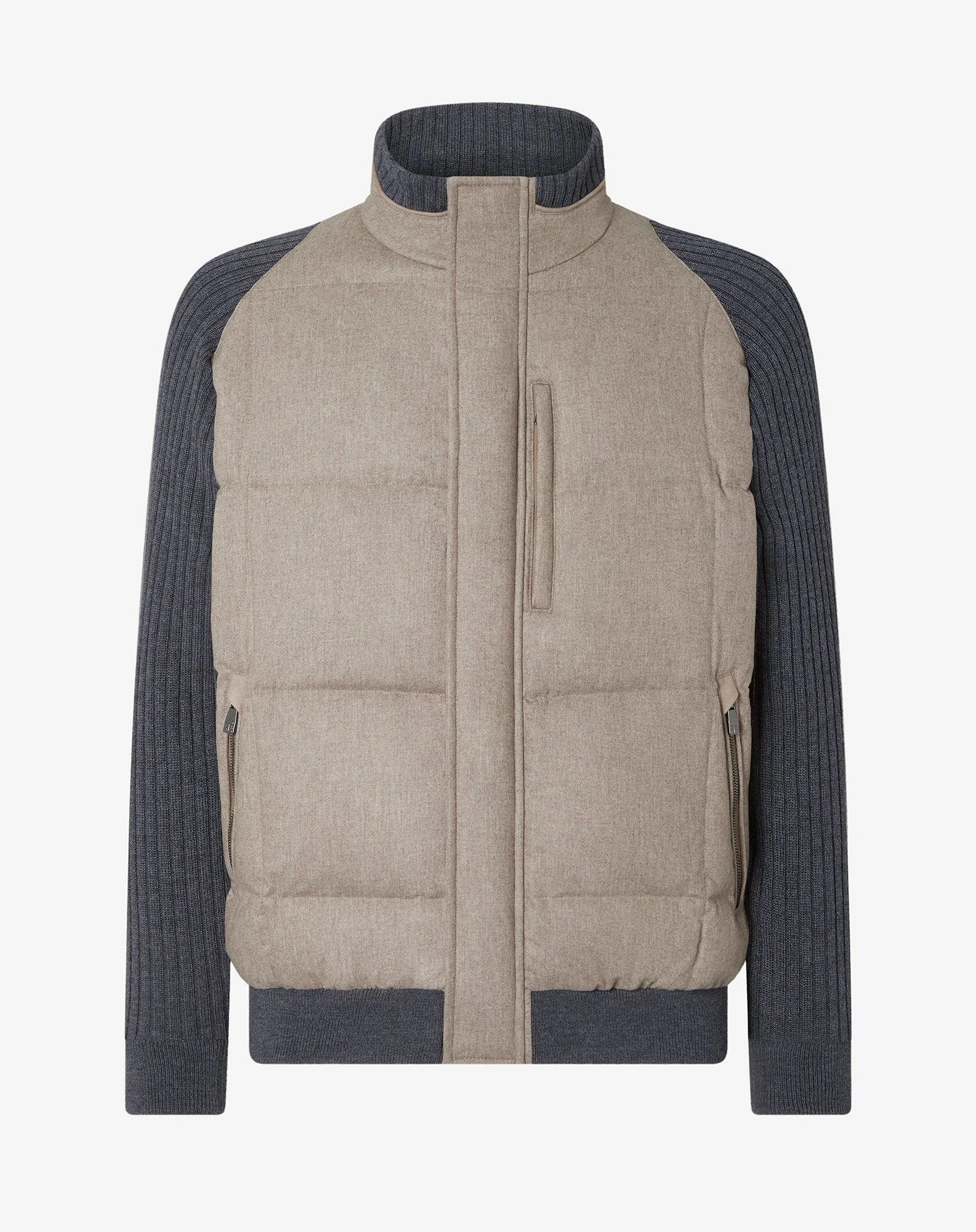 Beige technical stretch cashmere bomber jacket, the perfect blend between technology and the quality of fine fibres. Real down padding in the quilted body ensures warmth and lightness, enhanced by the comfort of the knitted sleeves, neckline and hem. The suede details on the pockets add a sophisticated touch, while the dual cursor zip closure and concealed snap buttons create a versatile, clean style. Made in Italy within the Microcashmere Project, blending the soft warmth of cashmere with the durability of polyamide, it offers unique performance and water resistance. DETAILS AND MATERIALS - 41% polyamide, 40% cashmere, 18% virgin wool, 1% elastane - two-fabric bomber jacket - real goose down padded body - knitted sleeves, neckline and hem - drop 7 - dual cursor zip and concealed snap button front closure - welt pockets with suede trim - nylon lining - vertical breast pocket with zip - length 68 cm - Made in Italy FIT & WASHING - Dry clean with perchloroethylene, do not bleach, do not tumble dry, maximum iron temperature 110°
