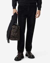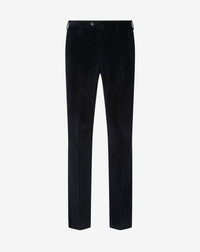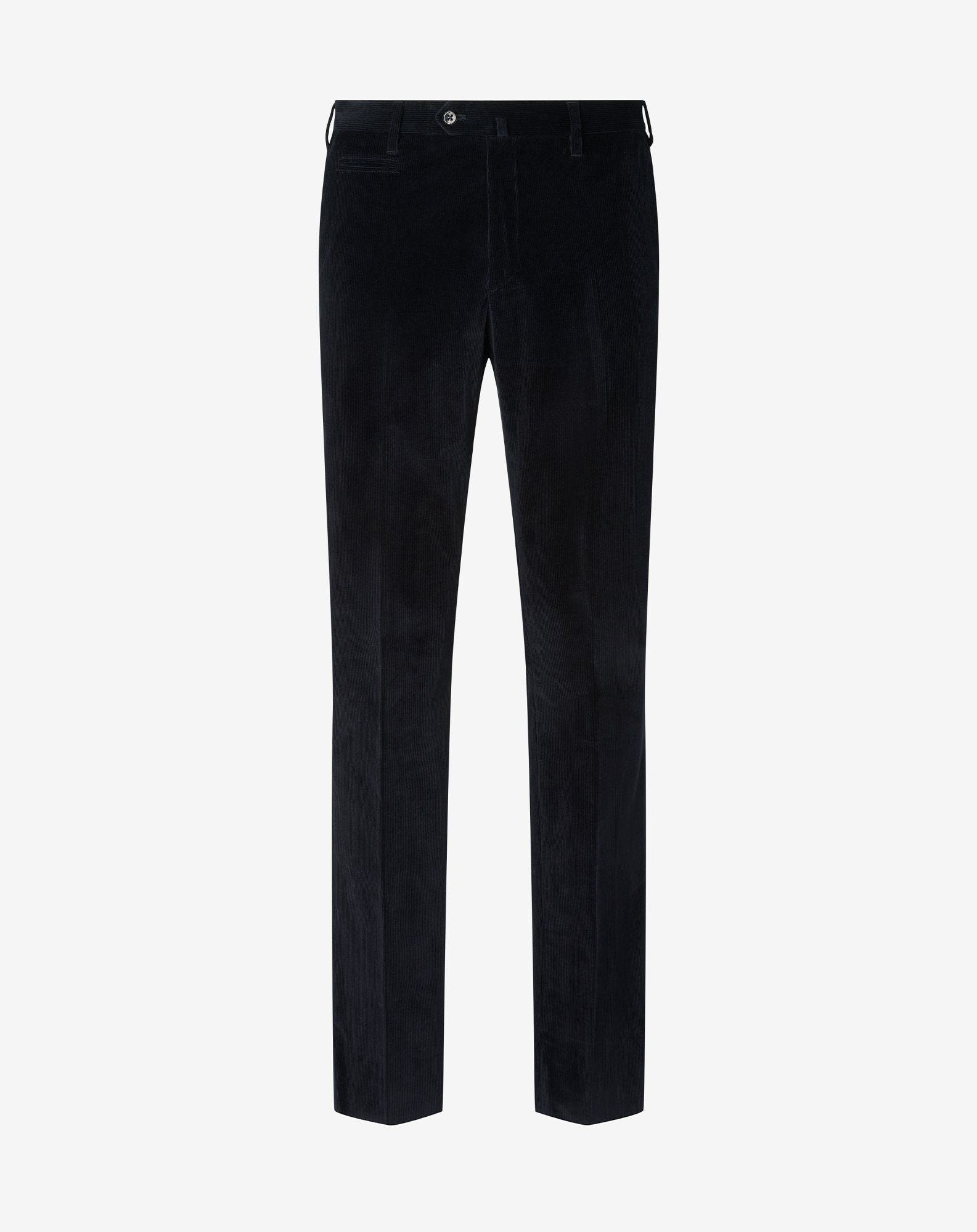 These black fine-ribbed stretch cotton corduroy trousers represent a perfect balance between classic and contemporary charm. The clean, pleat-free design is combined with a regular fit to enhance the silhouette with natural elegance. The sartorial structure is reflected in details such as the zip closure, the waistband with belt loops and V-shaped rear vent, and the coin pocket. Lined for greater comfort and defined by a 19 cm leg bottom, these trousers embody refined Italian craftsmanship, perfect for enhancing a sophisticated men's wardrobe. DETAILS AND MATERIALS - 98% cotton, 2% elastane - 1500 lines stretch cotton corduroy flat front trousers - drop 7 - regular fit - lined - front zip and waistband closure - belt loops and V-shaped vent on rear - watch pocket - slant side pockets - welted back pockets with zip - bottom width 19 cm FIT & WASHING - Dry clean with perchloroethylene, do not bleach, do not tumble dry, maximum iron temperature 110°