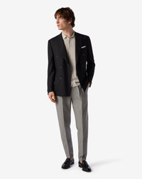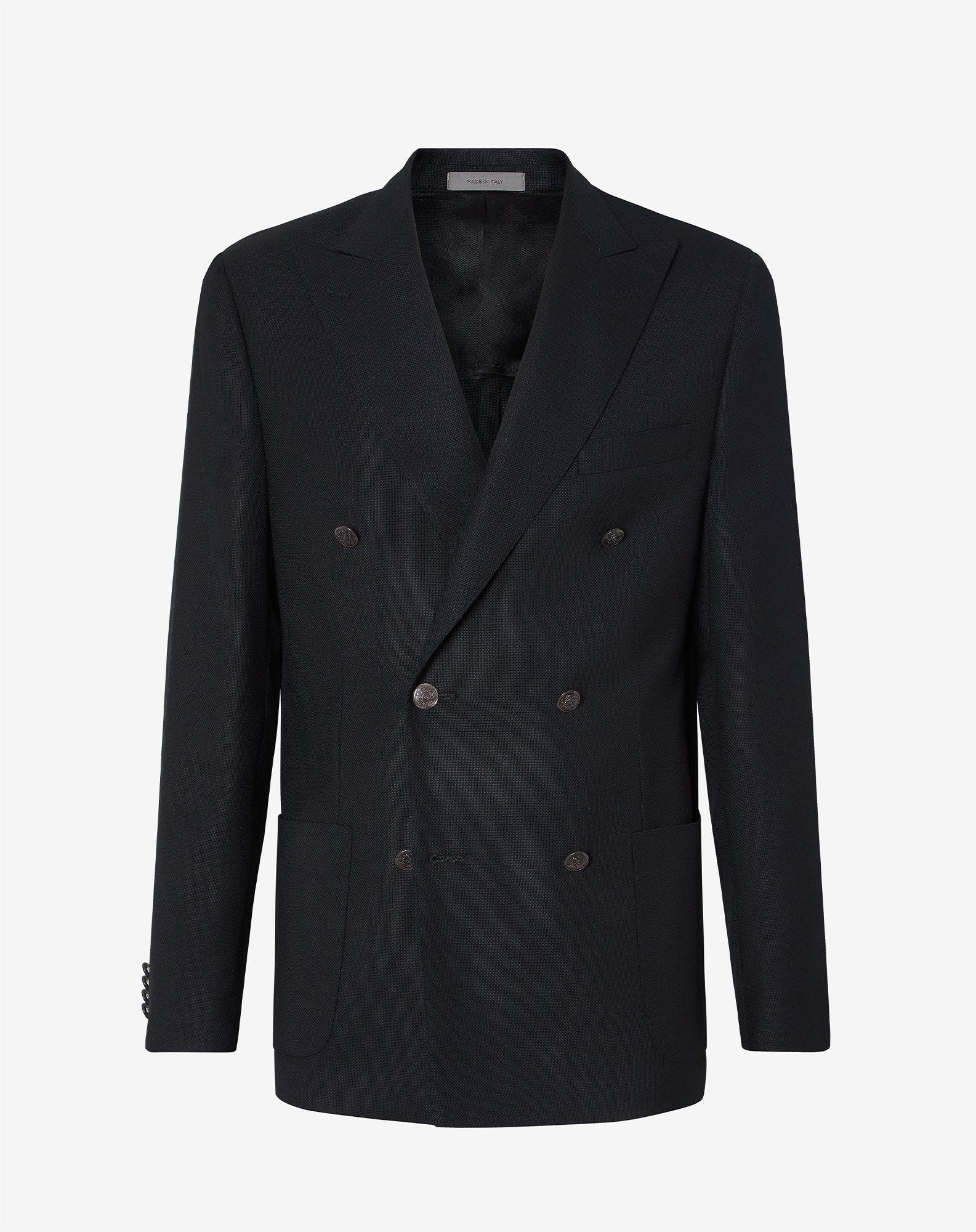 The unlined, double-breasted six-button hopsack Men's jacket has a slim fit, patch pockets and side vents at the back for greater ease of movement. Sartorial details such as the AMF stitching at the edge and the real horn buttons enhance the elegance of the garment without altering its casual style. Hopsack wool is characterised by a wider, more open weave, which makes this fabric extremely light, breathable and perfect for unlined jackets in the spring or summer season. DETAILS & MATERIALS - 100% virgin wool - double-breasted six-button S110's hopsack wool jacket - unlined - drop 7 - slim fit - pointy lapels - AMF stitching at the edge - breast pocket - appliqued pockets - side vents on the back - lapel width 11 cm - slanted iridescent lining - horn buttons - back length 74 cm - Made in Italy FIT & WASHING - The model is wearing a size 50 (IT). Model measurements: height 187cm, chest 98cm, waist 82cm, hips 98cm. Dry clean with perchloroethylene, do not bleach, iron at 110° maximum, do not use dryer
