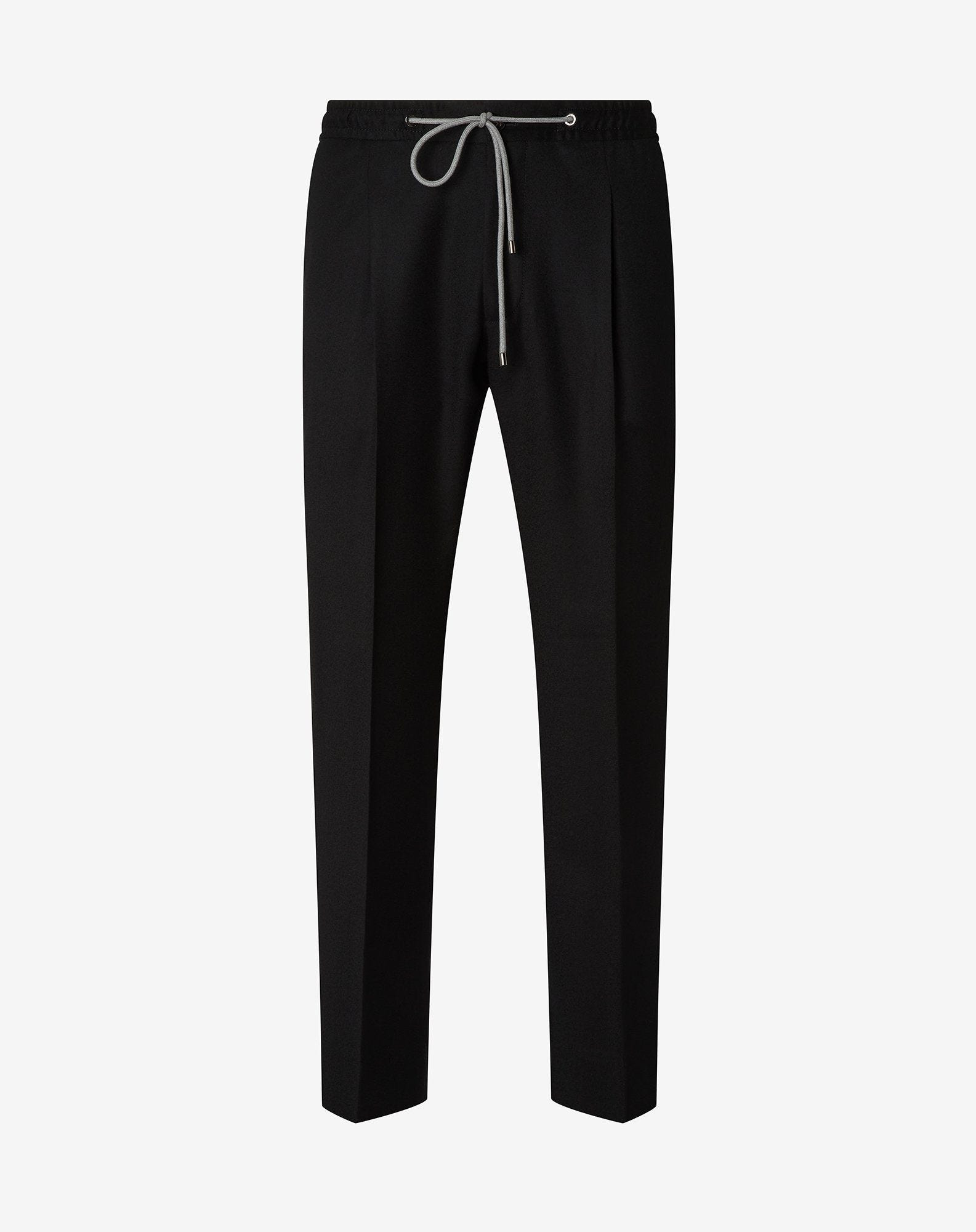 A garment that interprets modernity with a sartorial spirit and evolved functionality. These black pure wool flannel joggers with front pleat and regular fit, combine comfort and style with a contemporary appeal. With their elastic waistband with drawstring, zip closure and practical slash pockets, they guarantee maximum freedom of movement and a relaxed but well-groomed look. Part of the Washable Project, they can be comfortably machine washed at 30° while keeping their silhouette intact. They are supplied with a special washing bag, to accompany your most dynamic moments in style. DETAILS AND MATERIALS - 100% virgin wool - Single-dart, machine washable pure wool flannel joggers - unlined - drop 6 - regular fit - regular waist - zip closure - elastic waistband with drawstring - slant side pockets - welt back pockets with button - bottom width 18.5 cm - comes with washing machine protective bag FIT & WASHING - This garment has a regular fit. The model is wearing a size 50 (IT). Model’s measurements: height 187cm, chest 98cm, waist 82cm, hips 98cm. Maximum wash temperature 30°, do not bleach, dry clean with perchloroethylene, do not tumble dry, maximum iron temperature 110°