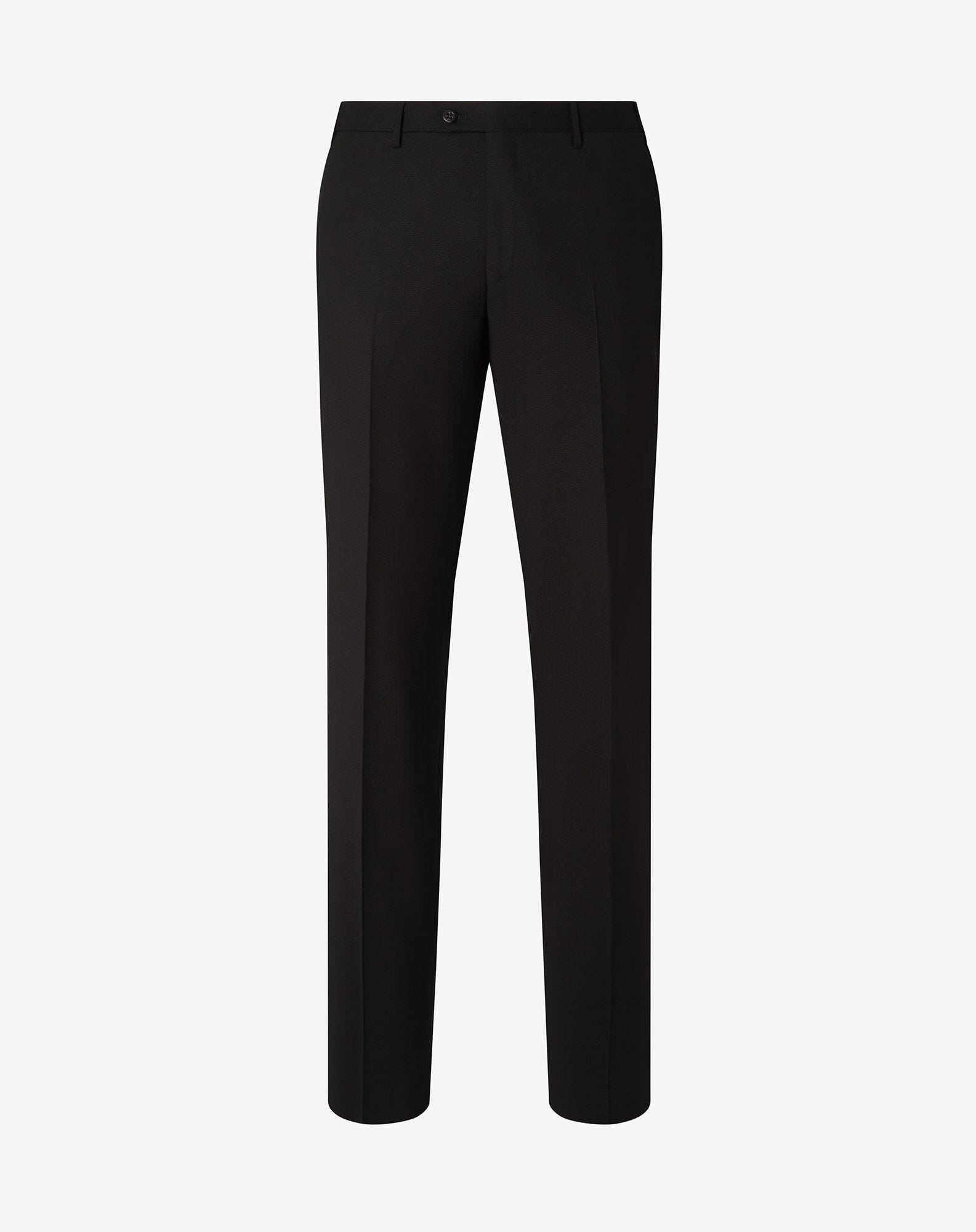 Crafted from a fine virgin wool bengaline with a slightly stretch component, these black trousers stand out for their minimalist design and regular fit. Their flat front design with front waistband and zip fastening enhances the silhouette while keeping a natural comfort. Sartorial details like the belt with V-shaped rear vent, slanted side pockets and double-welted back pockets with buttons complete this versatile garment, perfect for everyday elegance. DETAILS AND MATERIALS - 98% virgin wool, 2% elastane - stretch wool bengaline flat front trousers - drop 7 - regular fit - lined - front zip and waistband closure - belt loops and V-shaped vent on rear - slant side pockets - double-welt and button back pockets - bottom width 19 cm FIT & WASHING - Dry clean with perchloroethylene, do not bleach, do not tumble dry, maximum iron temperature 110°