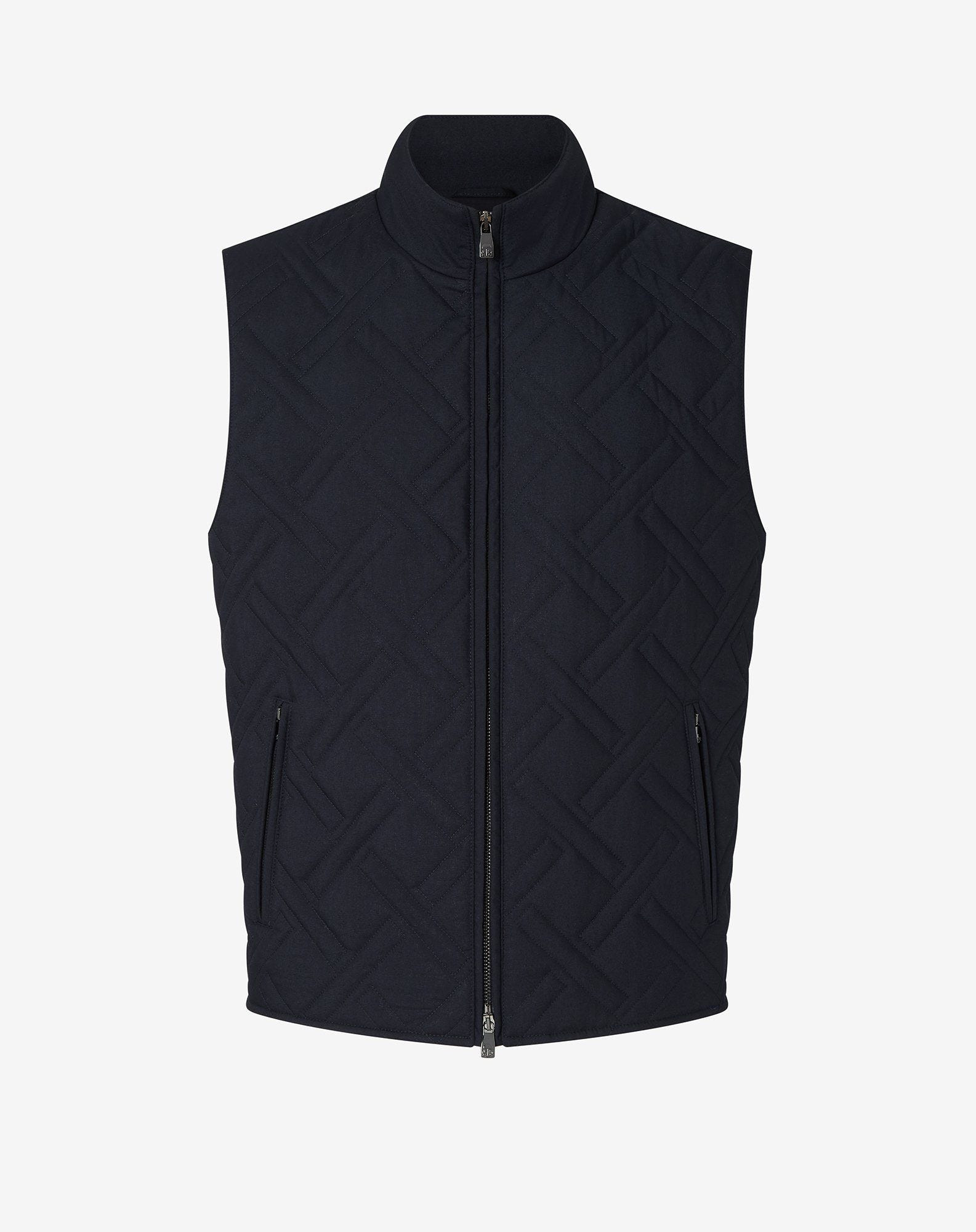 The blue vest in technical fabric combines functionality with contemporary style. Padded with wadding and quilted at the front, it features a metal two-way zip and two practical zipped pockets. With its minimalist design and 65 cm length, it is the perfect piece for a modern, versatile look. DETAILS AND MATERIALS - 80% polyester, 20% viscose - wadding-padded vest - drop 7 - front quilting with metal two-way zip closure two zipped pockets - length 65 cm FIT & WASHING - Dry clean with perchloroethylene, do not bleach, do not tumble dry, maximum iron temperature 110°