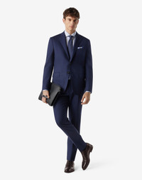 Elegance and quality in this single-breasted blue stretch wool suit. The special details, such as the notch lapels and the horn buttons, are enhanced by the natural shoulder design that underlines the natural shoulder shape and provides a more relaxed appeal. Everyday elegance made in Italy. DETAILS & MATERIALS - 100% wool - tropical stretch wool suit - single breasted two-button jacket - lined - regular fit - natural shoulders - sartorial AMF stitching - notch lapels - hemmed breast pocket - patch side pockets - double rear vent - horn buttons - lapel width 8.8 cm - back length 74 cm - flat front trousers - slant side pockets - waistband with belt loops - welt back pockets with button - bottom width 19 cm - Made in Italy FIT & WASHING - This garment has a classic fit. The model is wearing a size 50 (IT). Model measurements: height 187cm, chest 98cm, waist 82cm, hips 98cm. Dry clean with perchloroethylene, do not bleach, maximum iron temperature 110°, do not tumble dry