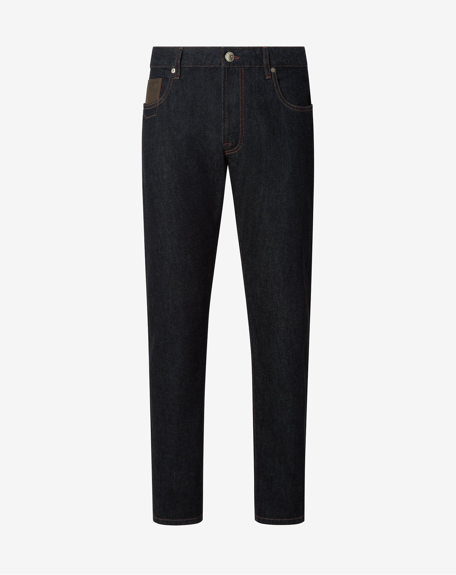 Blue jeans made from 11 oz stretch cotton: reinterpreting a classic with distinctive details. 5-Pocket denim style with regular fit and drop 7, designed to guarantee comfort and style on any occasion. Zip closure with personalized stud button, leather coin pocket and additional back pocket on the yoke with logo for an exclusive touch. Leg bottom width 19 cm, for a modern and versatile fit. DETAILS AND MATERIALS - 99% cotton, 1% elastane - 5-pocket denim trousers - drop 7 - 11 o.z - regular fit - personalized stud and zip closure - leather coin pocket - extra pocket on back yoke - logo on back patch - bottom width 19 cm FIT & WASHING - Dry clean with perchloroethylene, do not bleach, do not tumble dry, maximum iron temperature 110°