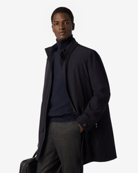 A modern reinterpretation of a classic item of Men's outerwear, this blue caban coat is made from water-resistant stretch technical fabric to provide protection and comfort. Its design is enhanced by a detachable quilted wadding lining, perfect for heat regulation that follows the season. Features dual cursor metal zip closure in front, concealed snap buttons, hydrozip pockets and a concealed hood under the collar. Functional details like the adjustable frog fasteners at the sleeve end make this a practical yet sartorial garment. DETAILS AND MATERIALS - 90% polyamide, 10% elastane - caban coat with detachable quilted wadding lining - drop 7 - metal dual cursor zip closure and concealed snap buttons - hydrozip on pockets - hidden hood - frog fasteners at sleeve end with snap buttons - length 90 cm FIT & WASHING - Dry clean with perchloroethylene, do not bleach, do not tumble dry, maximum iron temperature 110°