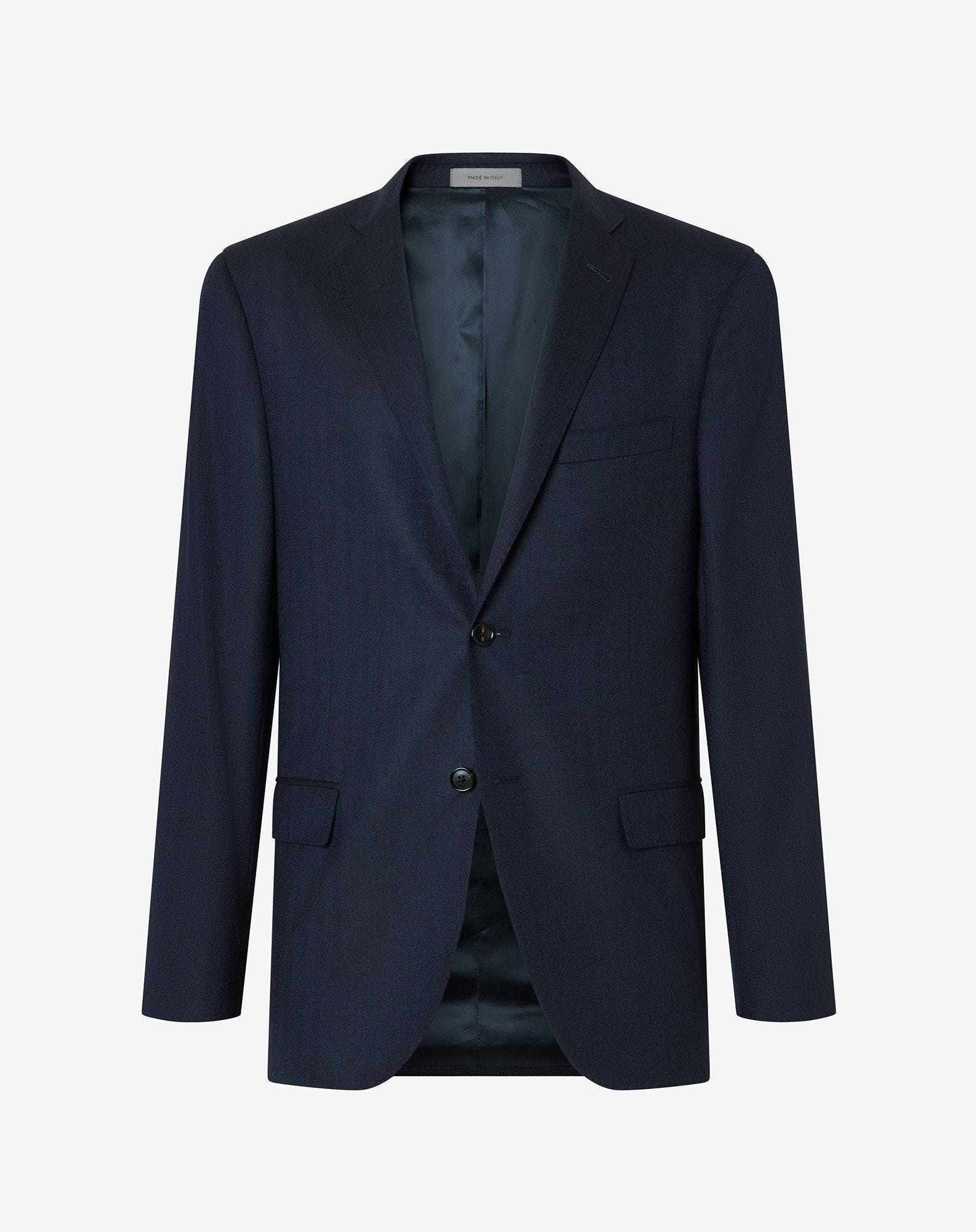 This blue two-button single-breasted jacket, part of the Academy Light range, interprets the contemporary men's wardrobe with refined ease. Made from stretch virgin wool with an elegant herringbone pattern, it features a regular fit and lined construction to guarantee comfort and lightness. Sartorial details, such as the AMF stitching at the edge, the real horn buttons, the notch lapels and the double vent at the back, reflect the artisanal quality of garments Made in Italy. The flapped side pockets and the welt breast pocket complete a versatile garment, ideal to accompany any occasion in style, from formal business to the most sophisticated leisure time. DETAILS AND MATERIALS - 97% virgin wool, 3% elastane - single-breasted 2-button stretch wool jacket with herringbone pattern - Academy Light range - lined - drop 7 - regular fit - AMF stitching at the edge - notch lapels - lapel width 6.6 cm - welt outbreast pocket - flap side pockets - double rear vent - horn buttons - length 74 cm - Made in Italy FIT & WASHING - This garment has a regular fit. The model is wearing a size 50 (IT). Model’s measurements: height 187cm, chest 98cm, waist 82cm, hips 98cm. Dry clean with perchloroethylene, do not bleach, do not tumble dry, maximum iron temperature 110°