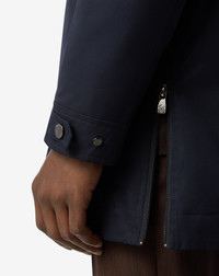 Designed to face the cold season with elegant functionality, this blue technical fabric caban coat combines clean lines with effective solutions. Featuring a fixed hood and detachable quilted inner jacket with microinjected padding, it offers heat protection that is also lightweight.The dual cursor zip closure in front and concealed snap buttons, the slanted welt pockets and the adjustable inner drawstring underline its sartorial attention to detail. Features technical fabric lining, and is completed by a dual zip at the hem for added functionality and comfort. A versatile garment for the man who seeks style and protection in one single gesture. DETAILS AND MATERIALS - 100% polyester - caban coat with fixed hood and detachable inner jacket - drop 7 - dual cursor zip and concealed snap button front closure - two slanted welt pockets in front - inner drawstring with adjusters - quilted inner jacket - micro-injected padding - technical fabric lining - dual zip at the bottom - length 85 cm FIT & WASHING - Dry clean with perchloroethylene, do not bleach, do not tumble dry, maximum iron temperature 110°