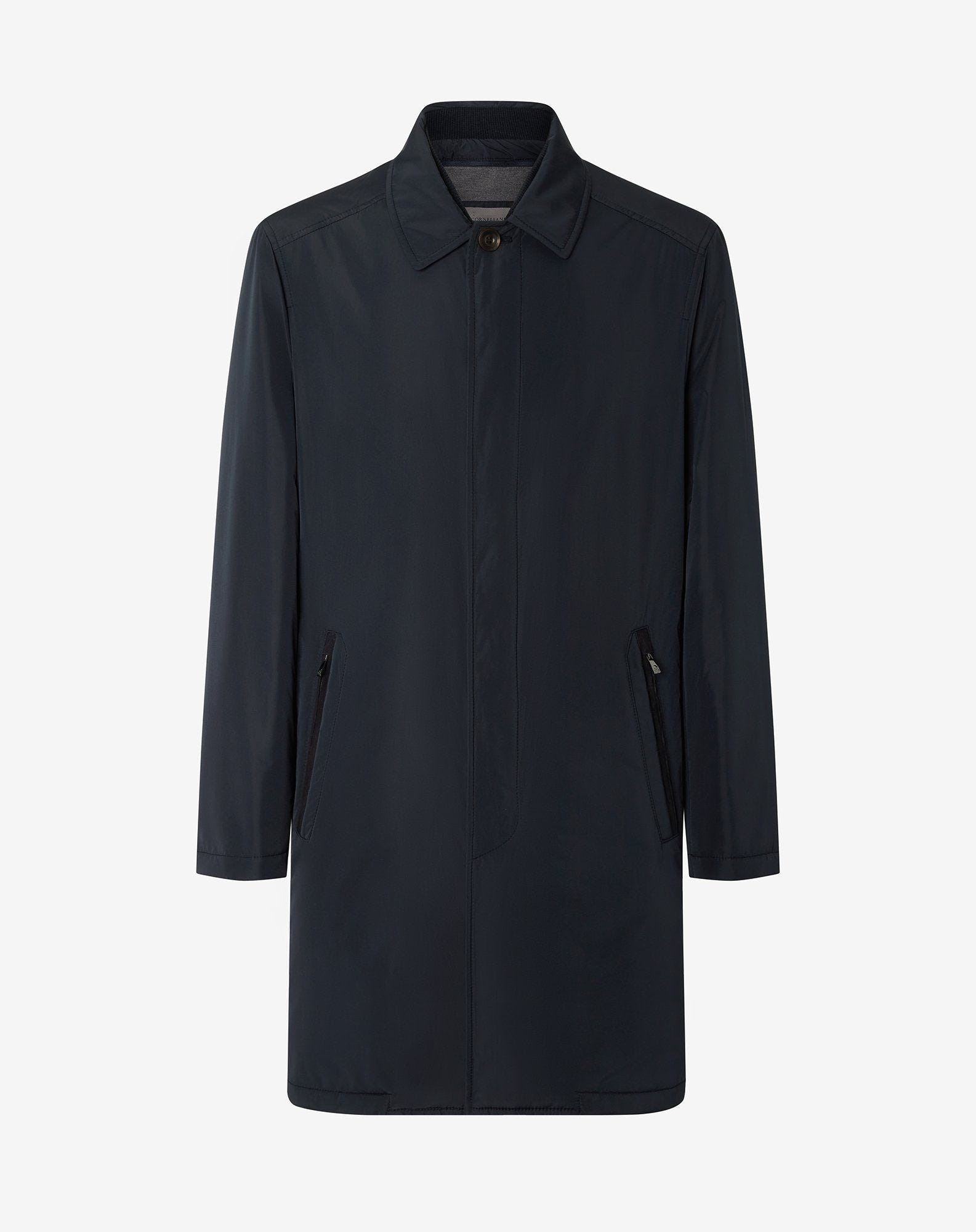 Modern functionality and sartorial sophistication meet in this blue technical fabric trench coat, designed to help you face the season in style. The fixed vest, enriched by a knit bomber collar and metal zip closure, offers an additional level of protection and a contemporary design note. The trench coat features an elegant shirt collar and a concealed 4-hole button closure for a clean and timeless aesthetic. Inside, the warm flannel lining and wadding padding guarantee comfort and protection on the coldest days, without sacrificing lightness and freedom of movement. This garment expresses all the quality and know-how of garments Made in Italy, designed to provide elegance and functionality for the contemporary man. DETAILS AND MATERIALS - 100% polyester - trench coat with shirt collar - fixed vest with knit bomber jacket collar and metal zip closure - drop 7 - concealed 4-hole button closure, except the first one - two double-welted pockets and suede garage - flannel lining - wadding padding - length 90 cm FIT & WASHING - Dry clean with perchloroethylene, do not bleach, do not tumble dry, maximum iron temperature 110°